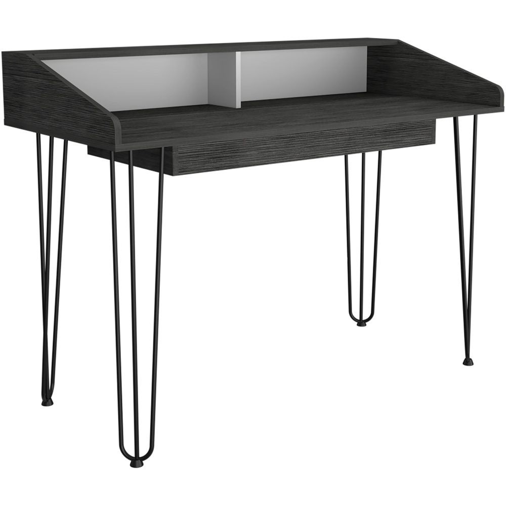 Elevate your workspace with the Dallas home office desk, a stylish and practical addition to any home. Its robust design boasts a reinforced base for unwavering stability, supported by sleek steel hairpin legs. Finished in a hardwearing, easy-to-clean white and carbon grey oak-effect melamine, this desk also features a matching upstand for a coordinated look.