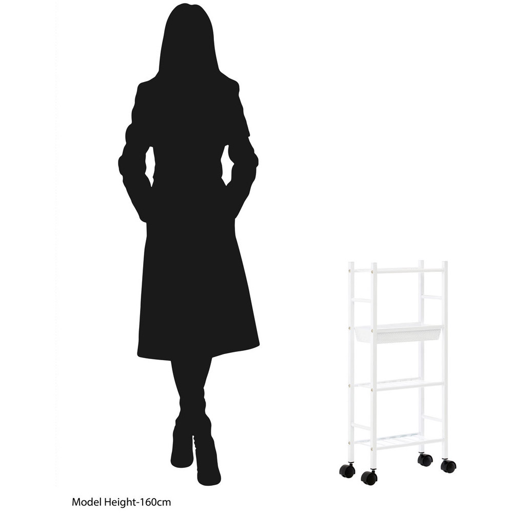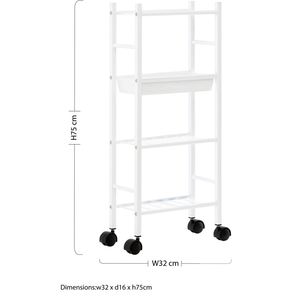 Effortlessly organise your home with this four-tier white trolley. Three shelves and a convenient basket provide ample storage for various items, making it a practical addition to any room. Its classic white finish complements most interiors, while the integrated wheels ensure easy mobility. Dimensions: 75 x 16 x 32cm.