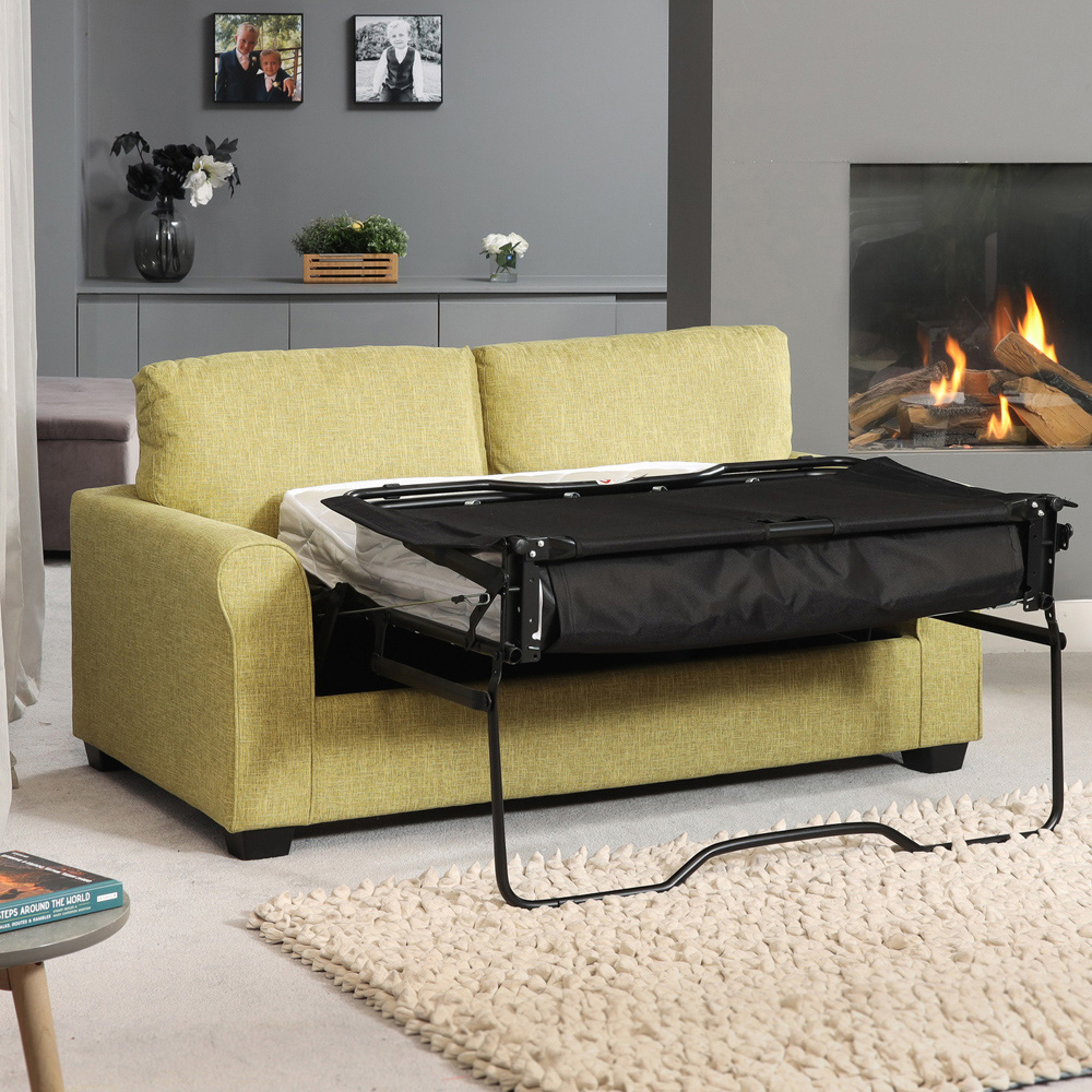 Sink into style with the Dawson 2 Seater Green Fabric Sofa Bed, a seamless blend of form and function. This sofa effortlessly transforms into a comfortable double bed with a spacious 180 x 100 x 10cm mattress, perfect for accommodating guests or enjoying a relaxing day. Built with a solid hardwood frame, this sofa bed ensures lasting durability and stability. The fixed-back design offers ample seating while maintaining a sleek, modern aesthetic that complements any living space. Upholstered in a hard-wearing textured green fabric, this sofa bed not only looks fantastic but also withstands the demands of everyday life. Its spacious pull-out design makes it perfect for overnight guests or providing a cosy spot for lounging. And to make things even easier, our two-man delivery team will assemble it for you, so you can enjoy your new furniture without any hassle.