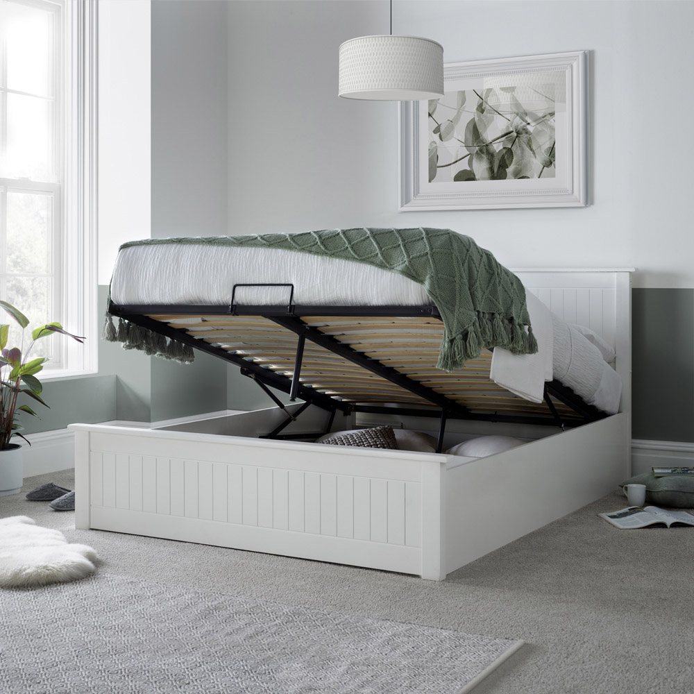 Upgrade your bedroom with the Dawson king-size white wooden ottoman storage bed. Its clean lines and serene white finish complement any décor. Effortlessly access the generously sized, fully boarded under-bed storage (divided into two convenient sections) thanks to powerful hydraulic pistons. Enjoy a naturally responsive sleep surface with the sprung slatted base. Crafted from durable solid rubberwood, this bed beautifully blends aesthetics and practicality. Delivered flat-packed for easy assembly in your chosen room. Features a 40cm side rail and footboard height. Self-assembly required.
