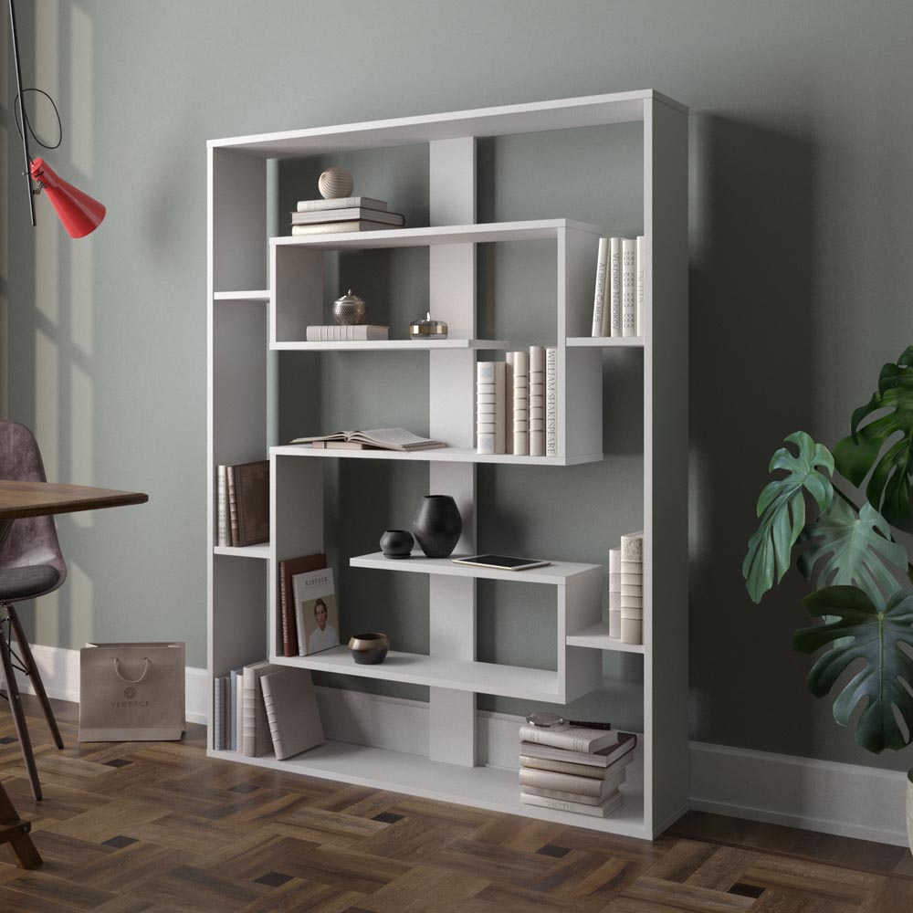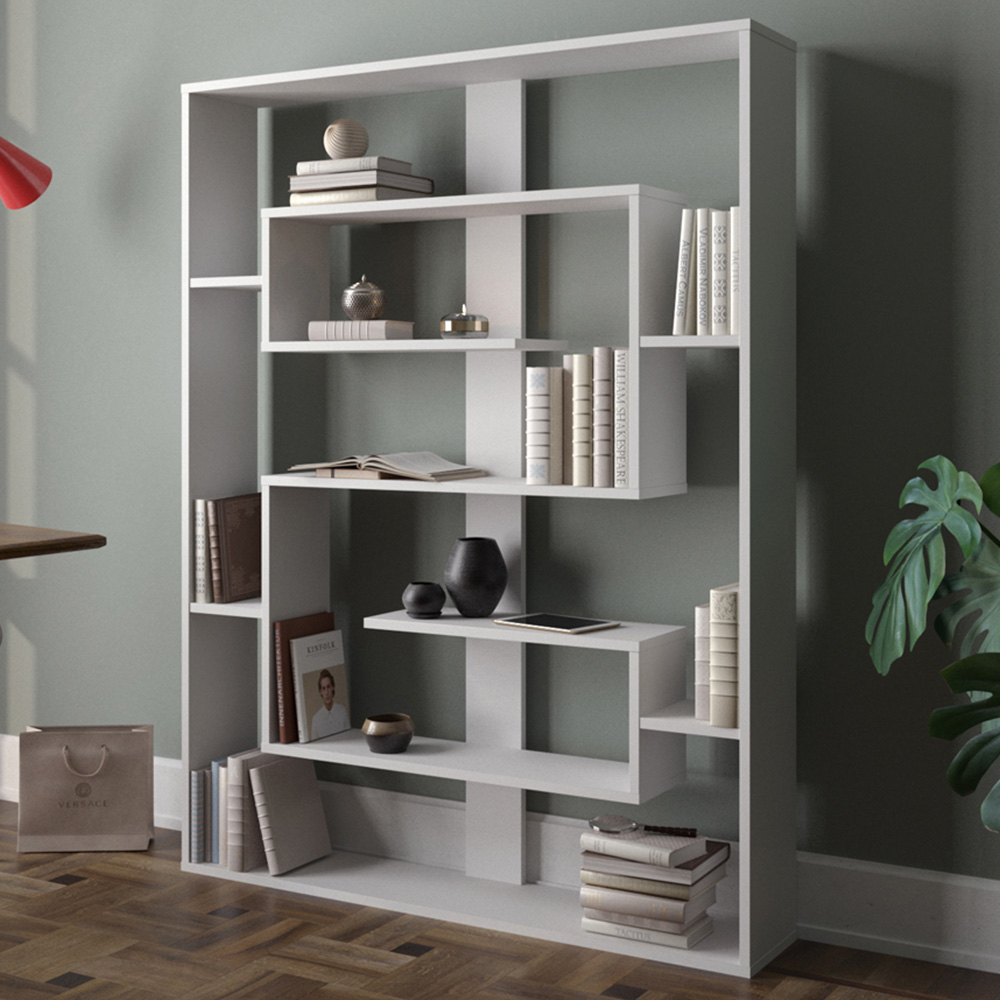 Make a statement with the Esteban geometric bookcase, a modern design that's as eye-catching as it is practical. Standing 156cm tall and 120cm wide, its striking silhouette features eight tiers of varying heights and widths, providing ample space for displaying framed photos, potted plants, artful accents and prized possessions of all sizes.