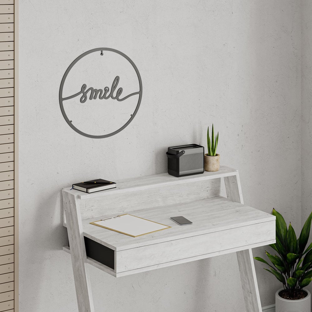 Make a statement with the Black Smile Theme Metal Wall Art. This elegant piece, measuring 46cm high and 42.50cm wide, features the word "Smile" in a stylish script font. Crafted from lightweight yet sturdy metal, it's easy to install and arrives safely packaged. This striking wall sculpture adds a touch of sophistication and a powerful message to any space. Plus, it comes with a reassuring two-year warranty.
