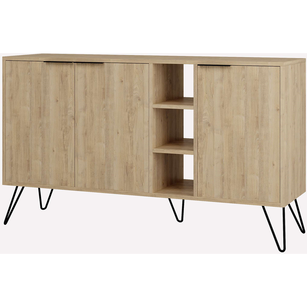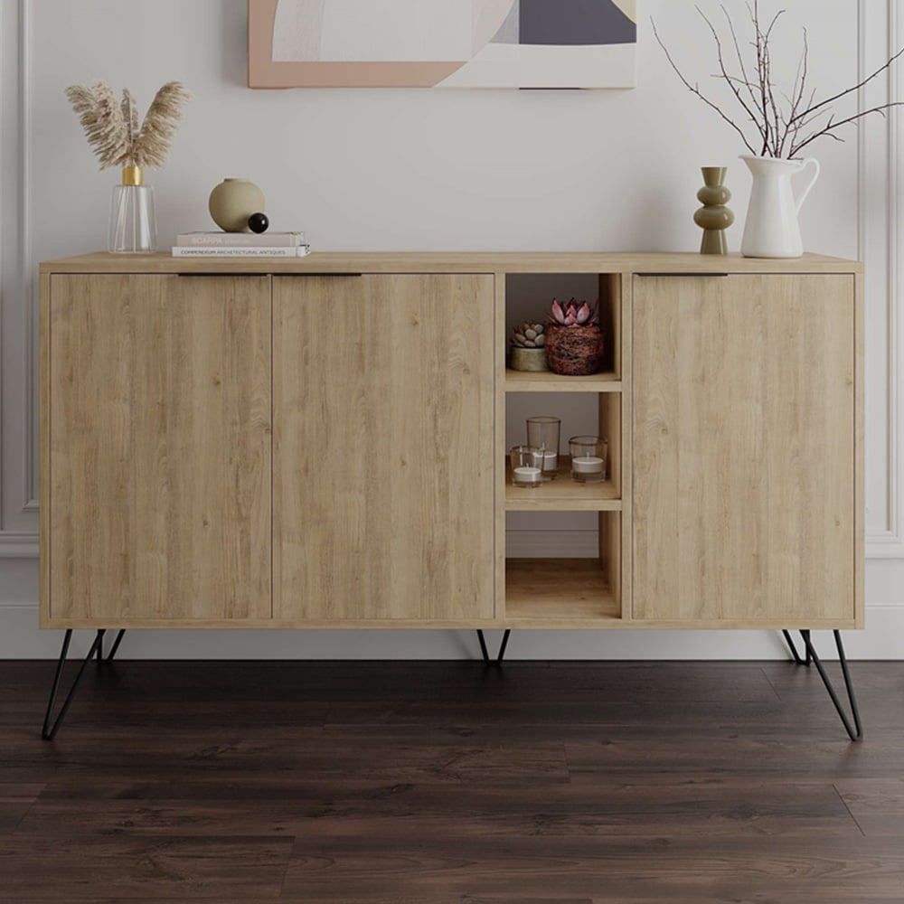 Elevate your home decor with the Decortie Clara Oak 3 Door 3 Shelf Console Sideboard. This unique cabinet offers generous storage space, with an interior shelf in each compartment to help keep your items organised. Designed with durable engineered wood and a protective melamine finish, it ensures long-lasting use and easy maintenance. The sturdy hairpin metal legs provide stability while adding a contemporary touch to your decor. Measuring 142 x 36 x 83 cm, this console unit fits effortlessly into various spaces, making it a stylish and practical addition to your home. It is packaged in durable, recyclable materials to ensure safe delivery. Assembly is easy with clear instructions included for setup.