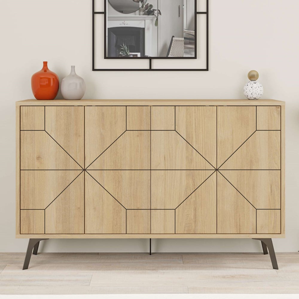 Transform your home with the Decortie Dune Oak 4 Door Console Sideboard. This stylish and unique sideboard features sleek metal legs and a contemporary aesthetic that enhances any room's character. This display unit seamlessly matches any existing decor. It is packaged in durable, recyclable materials to ensure safe delivery. Assembly is easy with clear instructions included for setup.
