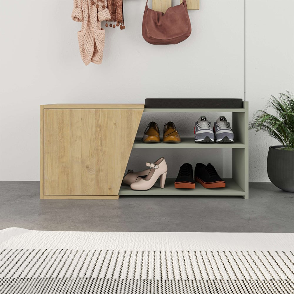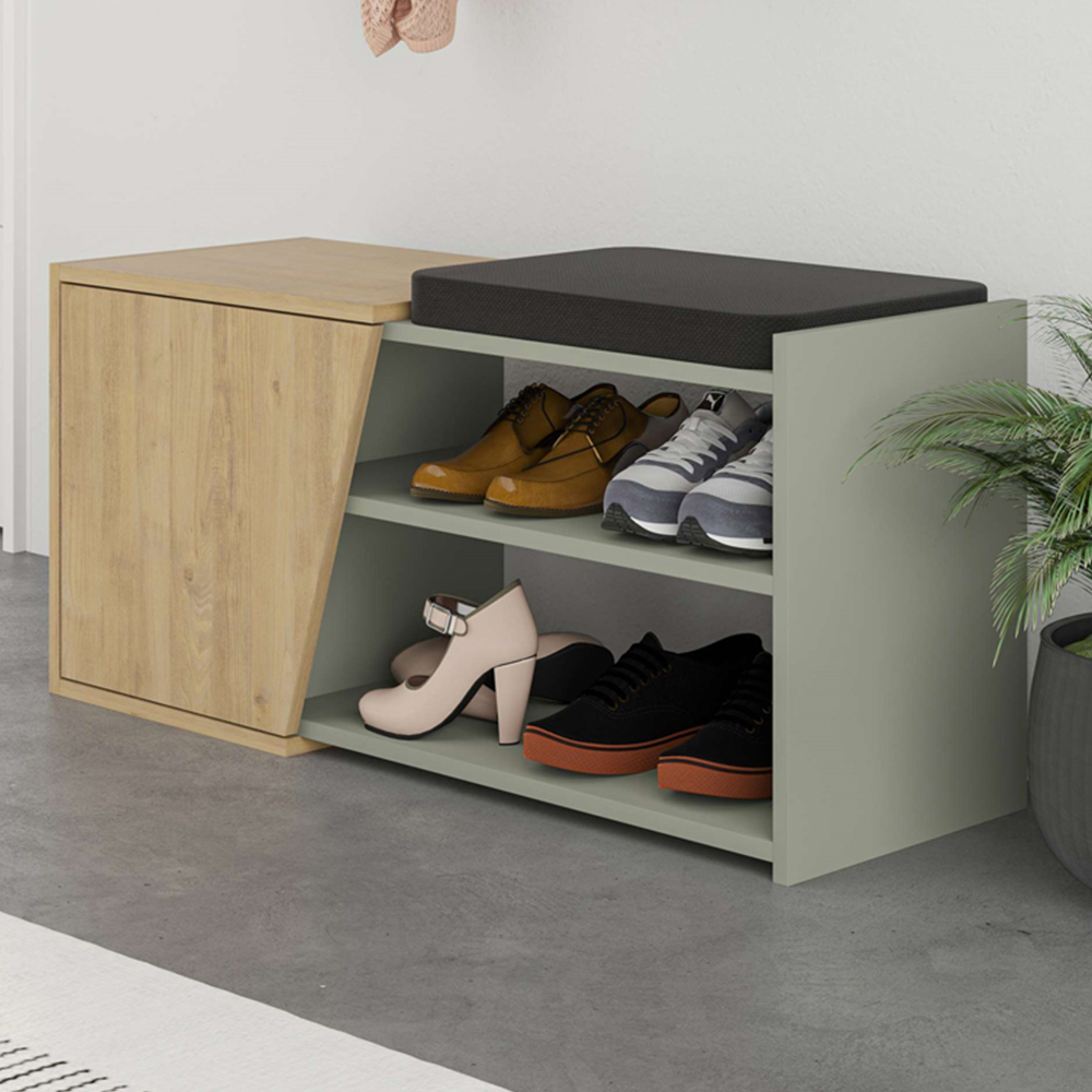 Transform your entryway with the Decortie Fioana Single Door 2 Shelf Ash Green Oak Storage Bench, a perfect blend of style and functionality. This chic bench not only fits seamlessly into small spaces but also offers a plush cushion for added seating comfort. It features two shelves and a door, providing ample storage for up to eight pairs of shoes, helping you keep your space tidy and organised.
