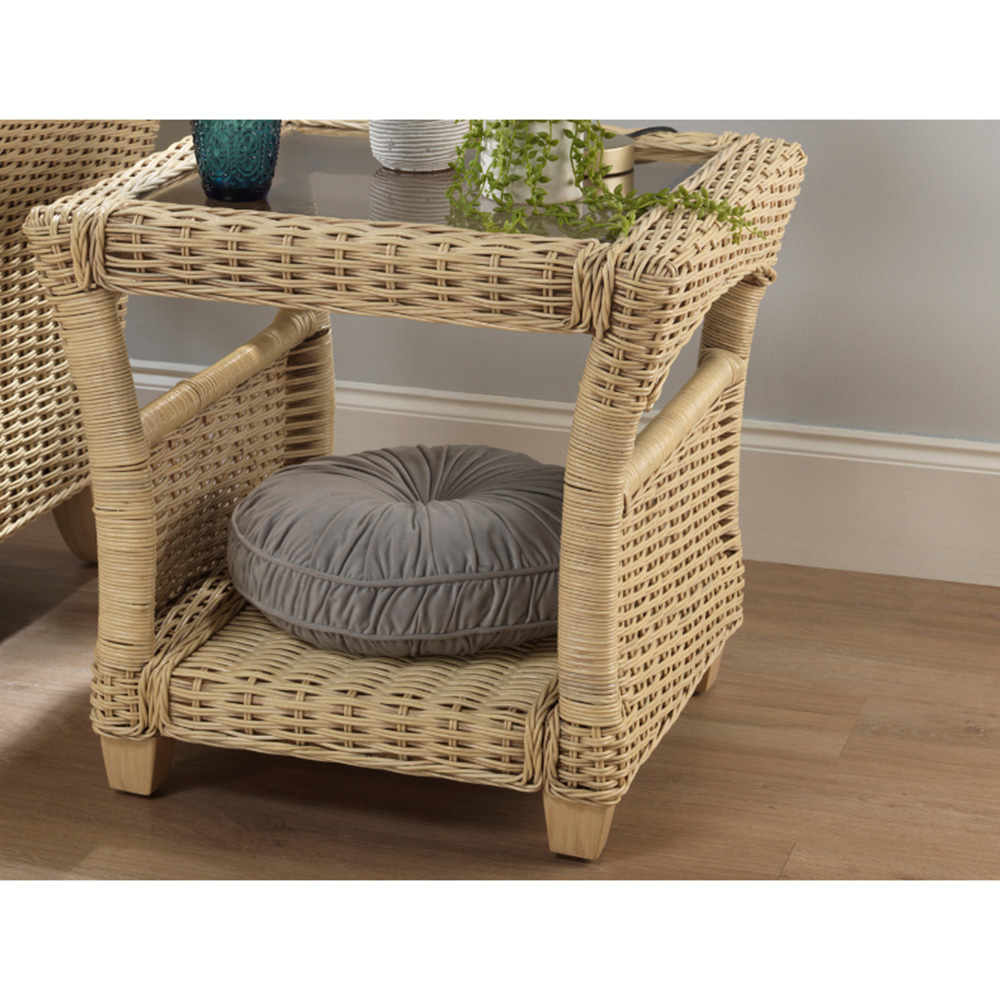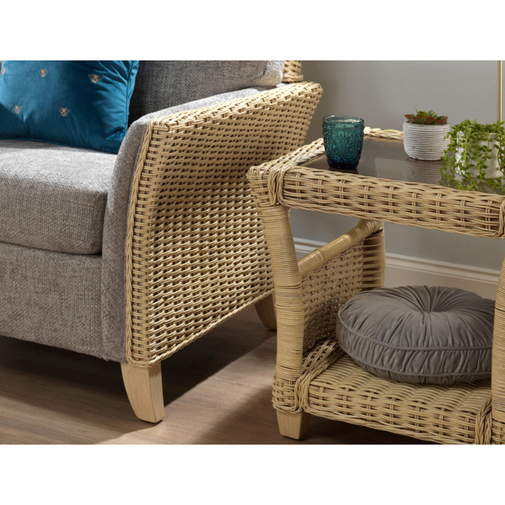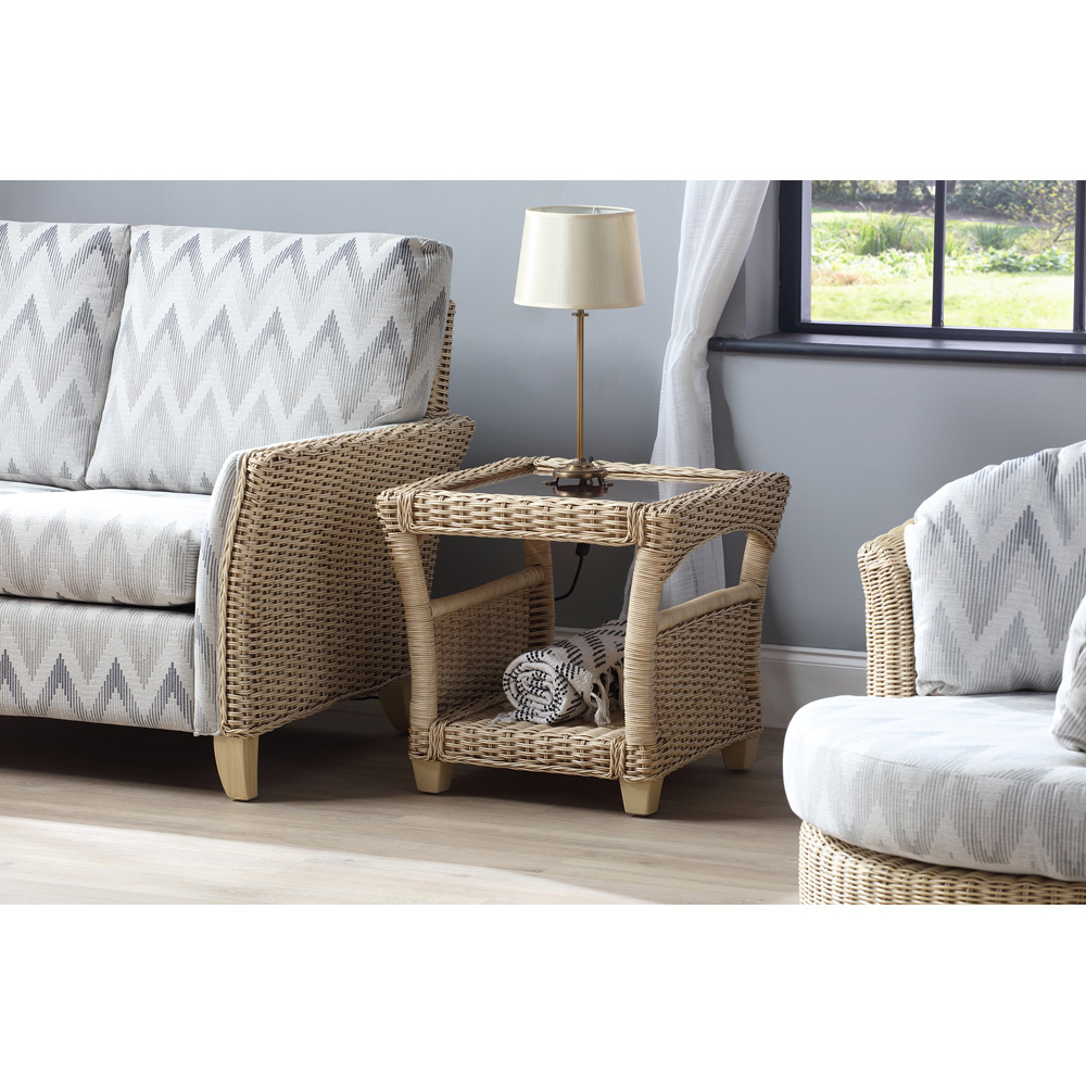Enhance your living room with the Arlington lamp table. Its beautiful natural-wash wicker weave and gracefully arched sides create a charming, inviting feel. The sturdy four-legged design supports a toughened glass top, perfect for displaying everyday items like cups, mugs, plates, and ornaments. A lower storage shelf, complete with woven sides to keep belongings secure, provides ample space for books, magazines, or newspapers. This versatile piece complements a variety of décor styles.