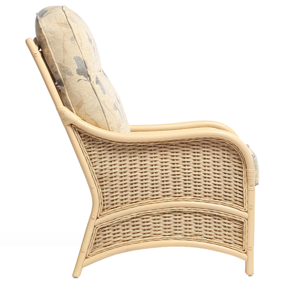 Bring home the Chelsea Conservatory Sofa Set and transform your living space. This elegant set includes a two-seater sofa and two armchairs, all crafted with a unique split rattan weave—a blend of thick and thin strands for a traditional style appealing to a wide audience. The high-back design ensures exceptional comfort, while the fully woven skirting and sides, and beautifully designed back, add to its sophisticated look, whether placed against a wall or as a statement piece. Sink into the luxurious UK hand-sewn cushions, upholstered in a reversible floral Oasis fabric (33% Polyester, 27% Polycotton, 40% Cotton), featuring Dacron warp for lasting wear. Enjoy the plush comfort of the foam-filled seat cushions and supportive fibre-filled back cushions, all with removable covers for easy dry cleaning. The handcrafted natural rattan frame completes this exquisitely comfortable and stylish set.