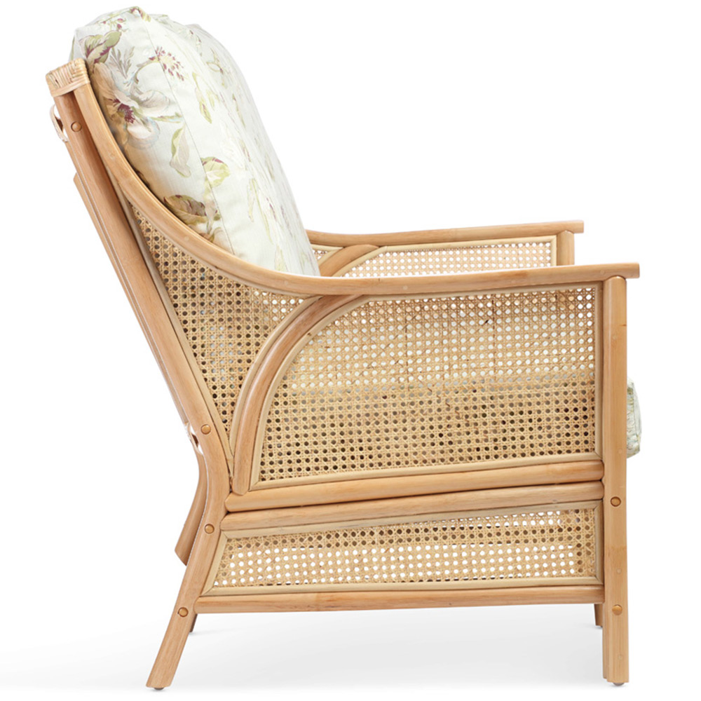 Elevate your living space with the Desser Chester 3-seater Natural Rattan Floral Sofa. Its natural rattan frame, with open cane mesh sides, back, and skirting, creates a stylish and airy feel without overwhelming the room. Hand-sewn in the UK, the reversible floral Lily cushions boast 100% cotton covers and clever Dacron warp construction to resist wear. Enjoy the plush comfort of the foam-filled seat cushions and supportive fibre-filled back cushions. Plus, removable covers make cleaning a breeze.