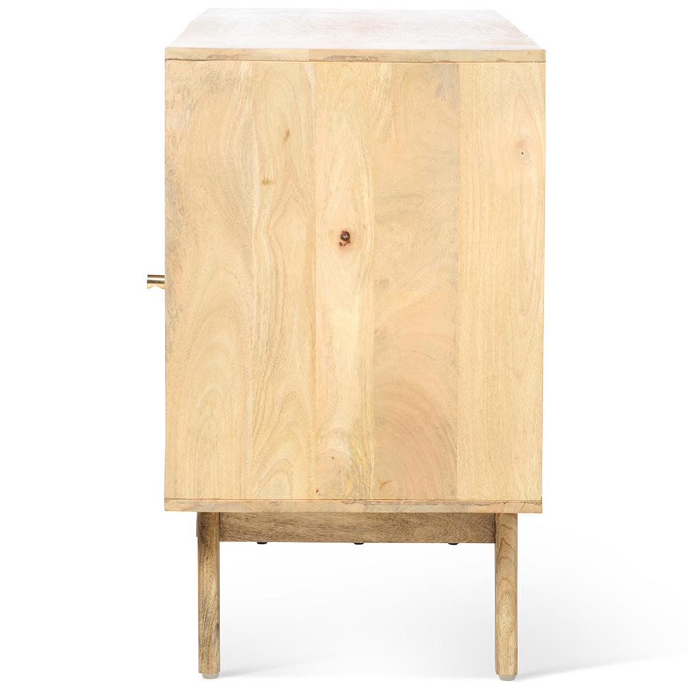 Elevate your home',s style with the Manhattan sideboard. This elegant piece, crafted from solid mango wood with sustainable natural rattan front panels and gold-handle detailing, offers both visual appeal and ample storage. The distinctive wood grain texture creates a unique and sophisticated look. Behind its sliding two-door design lie four compartments, perfect for keeping essentials organised. The smooth top surface completes the design, making it ideal for hallways, living areas, kitchens, or dining rooms. A truly tactile and visually stunning addition to any home.