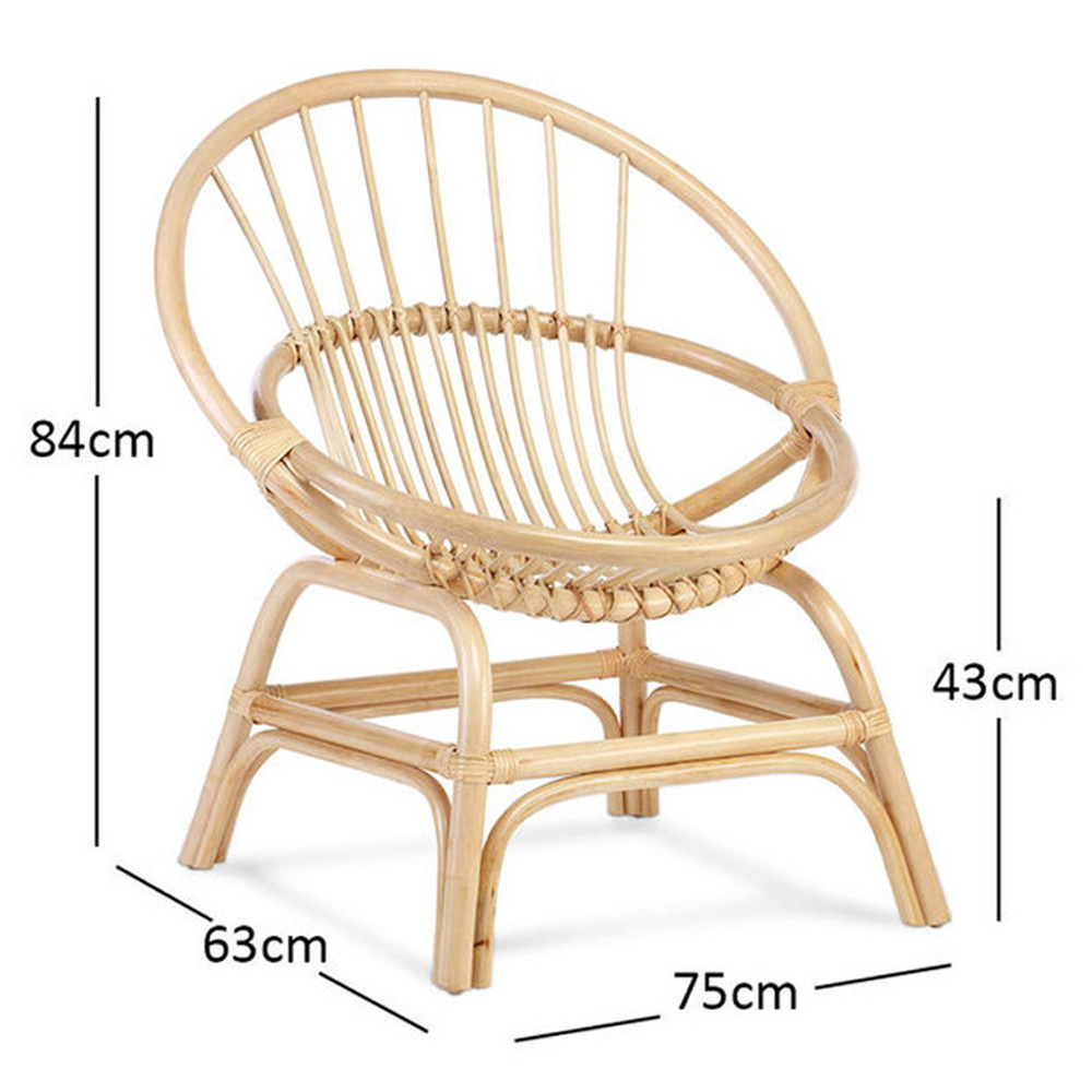 Embrace natural beauty with the Desser Moon Rattan Circular Chair. Its exquisite circular design in a natural rattan finish is a captivating addition to any space. Handcrafted with exceptional care, the sturdy cane frame and double-framed legs ensure lasting durability and comfortable support. The gently curving cane pole back provides a relaxing experience, making this chair the perfect spot to unwind. Made from natural rattan, this chair offers exceptional stability and support.