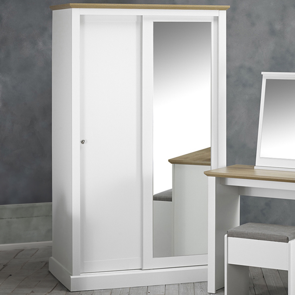 Maximize your bedroom space with the Devon 2-door sliding wardrobe. Its traditional design complements any décor, offering a stylish storage solution. One door features a mirror, the other is plain, providing both practicality and elegance. Choose from three beautiful finishes: oak and white, oak and charcoal, or oak. This wardrobe offers timeless elegance and convenience for your home.