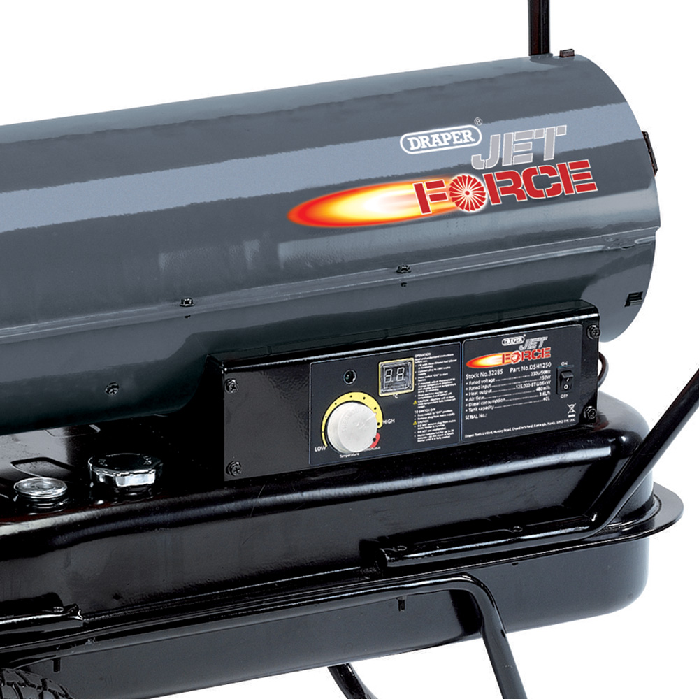 This Draper 36000W black diesel heater delivers powerful, efficient warmth to well-ventilated areas. Safety and efficiency are paramount, with features such as thermostatic control, automatic ignition, and a photocell safety device. The heater boasts versatility, accepting Grade 2 or higher kerosene and diesel fuel, and ensures a clean burn via its in-line fuel filter. Enjoy economical and eco-conscious heating with its 40L fuel tank providing an impressive 11-hour burn time at 125,000 BTU per hour.