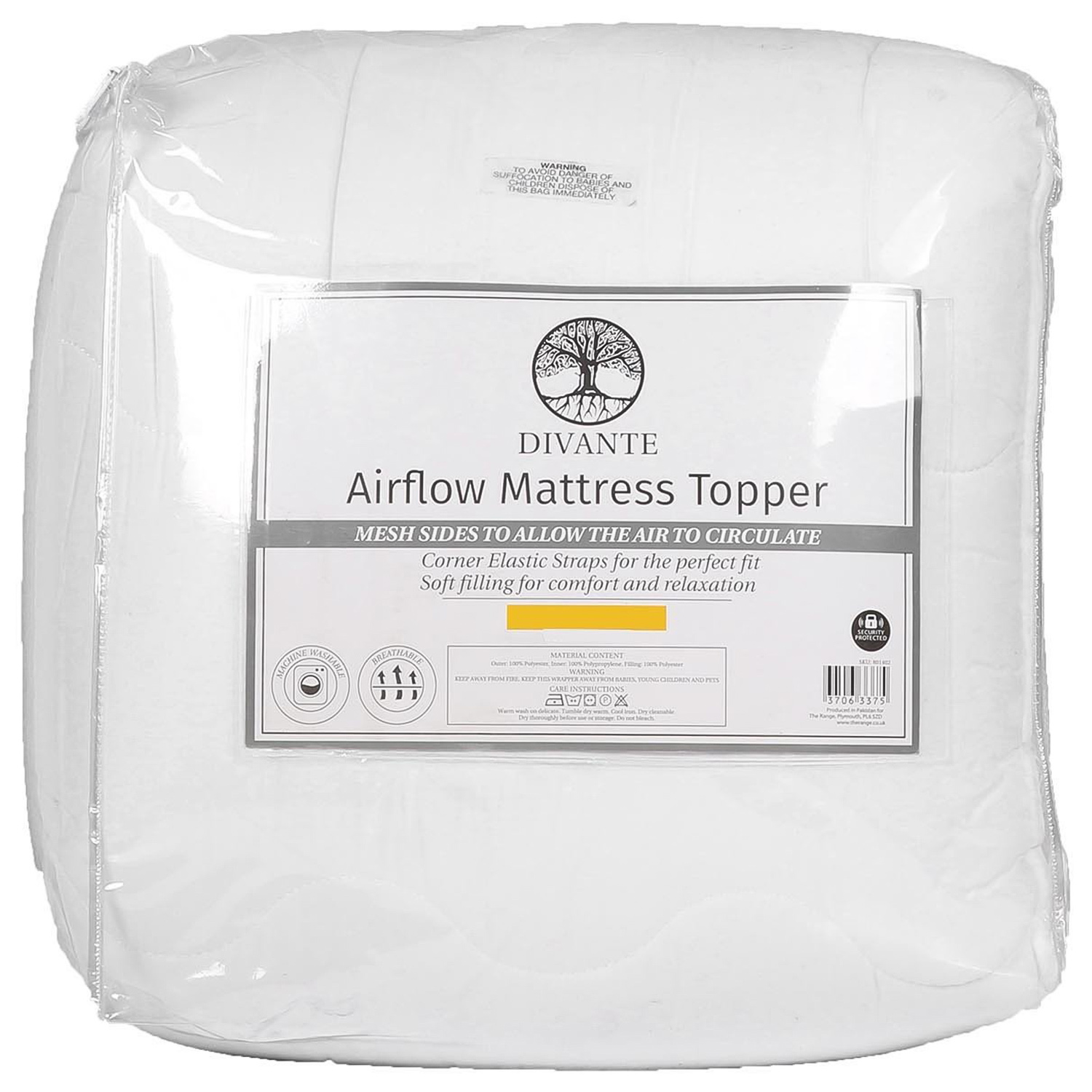 Experience blissful sleep with the Airflow Mattress Topper. Its side mesh panels promote air circulation, keeping your mattress fresh and extending its life. The soft filling adds a luxurious layer of comfort for a more restful night. Securely fitted with elasticated corners, and conveniently machine washable for easy care, this topper is a practical and comfortable choice for any home.