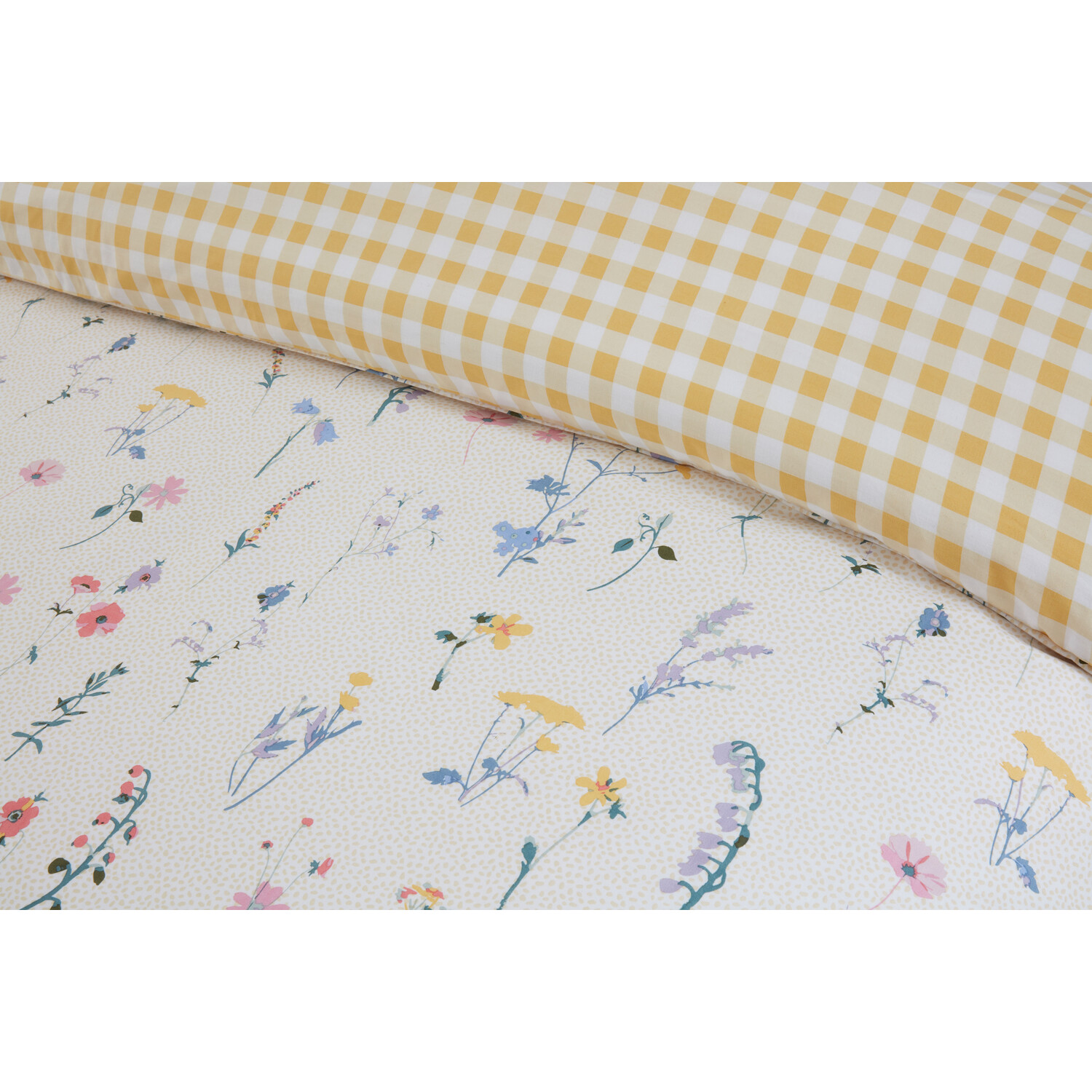 Bring the beauty of a wildflower meadow into your bedroom with this charming duvet cover and pillowcase set. One side showcases a vibrant floral print, while the reverse offers a cheerful yellow gingham pattern, creating a versatile bedding option to brighten your home.