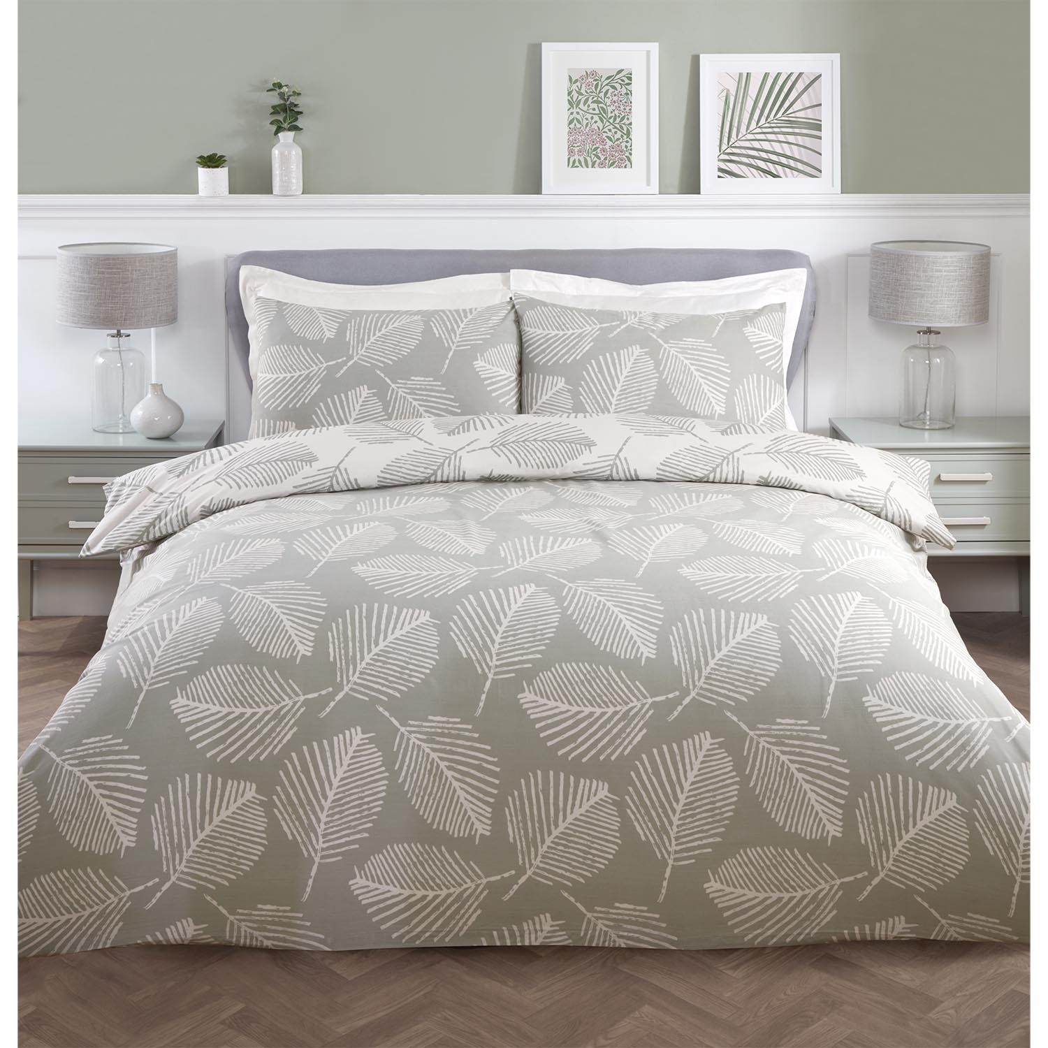 A soft green and white palette featuring a simple leaf design. The Falling Leaves duvet cover and pillowcase set adds a touch of stylish botanical elegance to any bedroom. This bedding set offers both comfort and style.