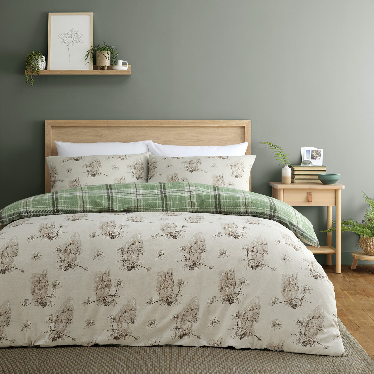 Experience the cosy charm of the Newbridge Forest Duvet Cover and Pillowcase Set. Exclusive to the Divante collection at The Range, this double-sided set boasts a refreshing green check pattern on one side and a delightful squirrel woodland design on the reverse. Soft, comfortable, and easy to care for, this set ensures a peaceful night's sleep.