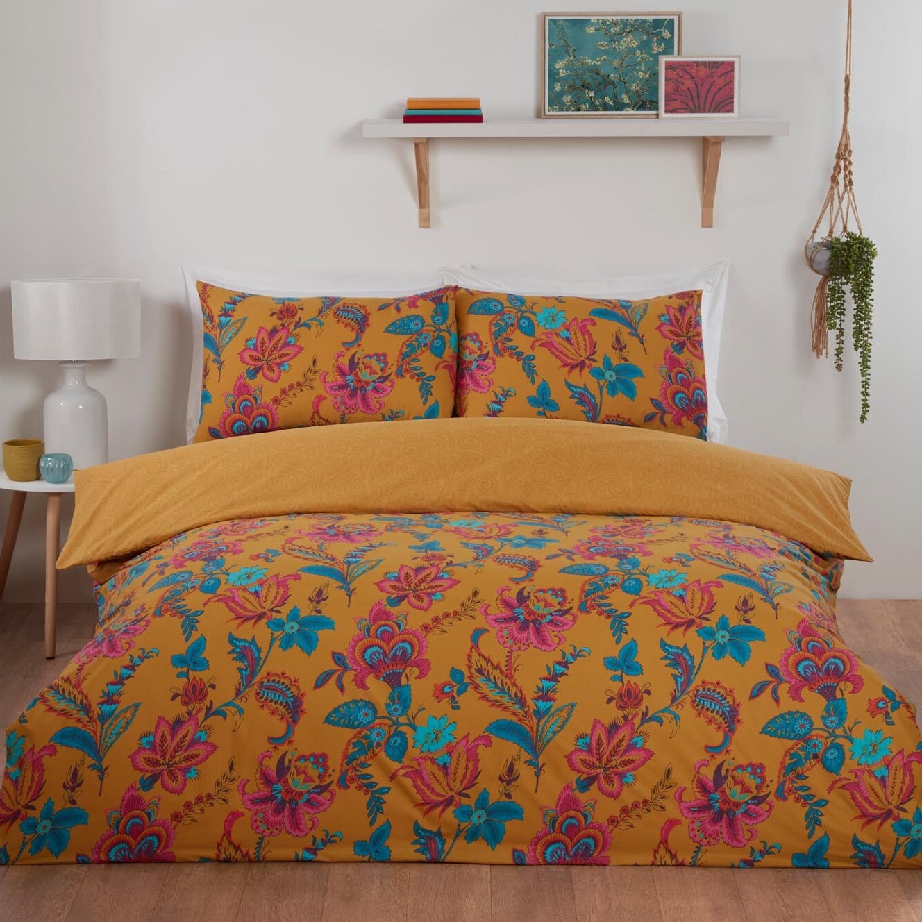 Elevate your bedroom's aesthetic with the Safia Duvet Cover and Pillowcase Set. A vibrant ochre base is enlivened by an elegant floral pattern in shades of blue and pink, instantly refreshing your space. This reversible set offers two distinct looks. Exclusively from the Divante collection.