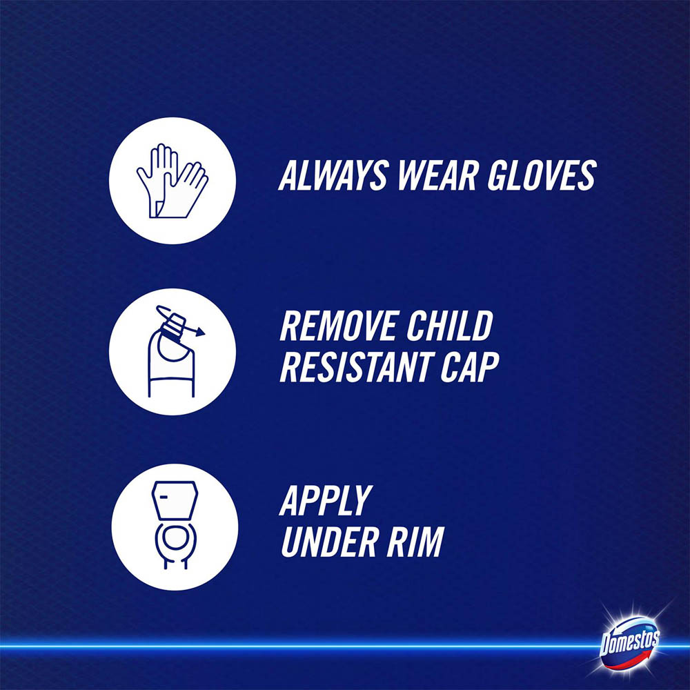 To use, simply unscrew the cap and apply the gel evenly under the rim. For optimal results, cover the entire toilet bowl and allow the product to work for 30 minutes. A quick brush may be needed for stubborn stains, and feel free to reapply to tackle tough cleaning tasks. Experience the confidence of a truly hygienic bathroom with Domestos.