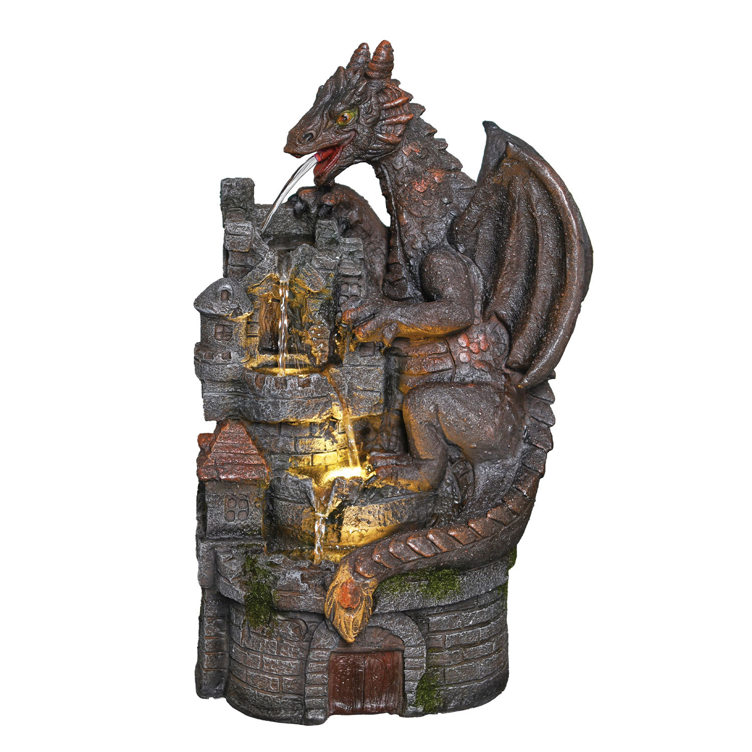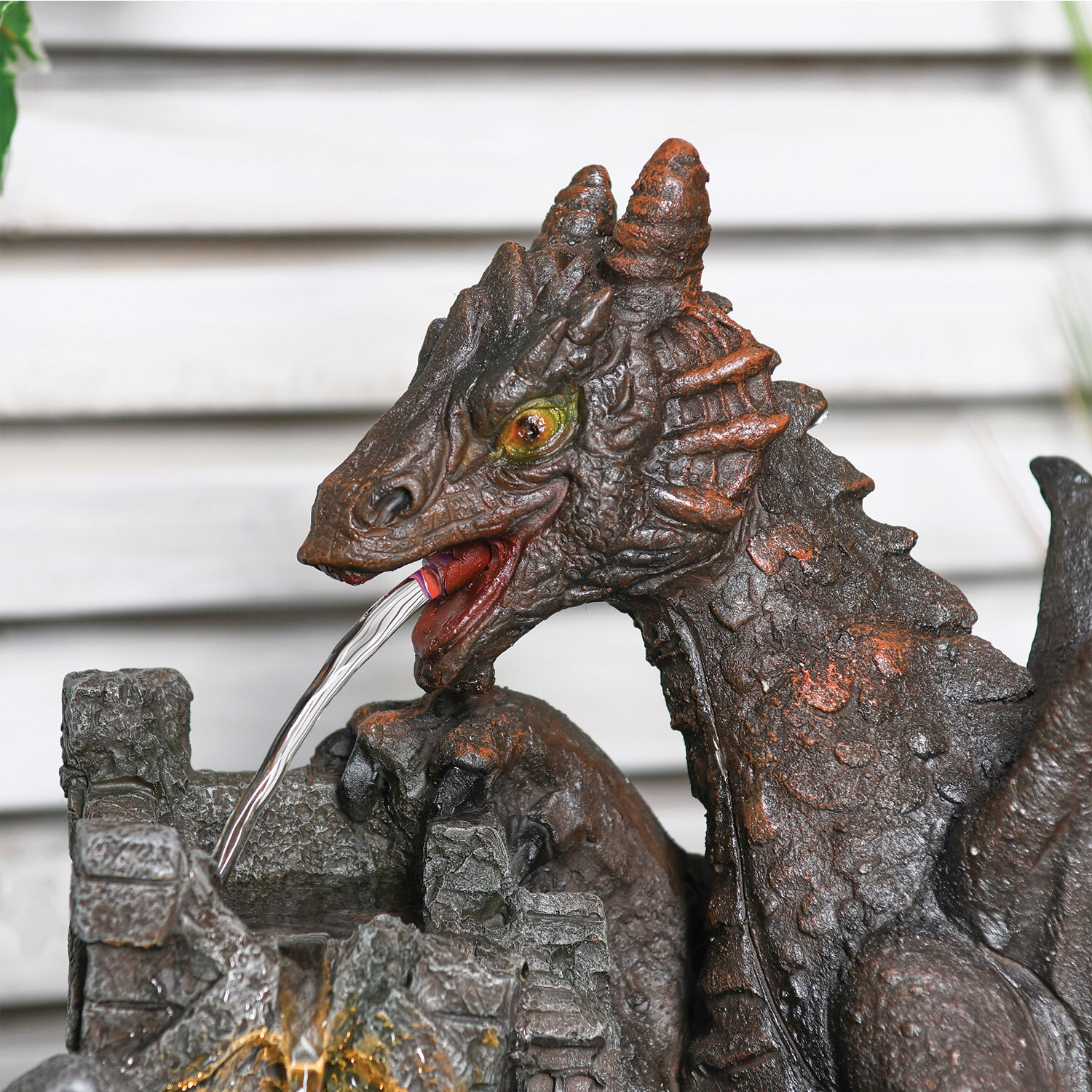 Commanding attention in any garden, the Dragons Keep Water Feature is a truly captivating addition for fantasy enthusiasts. This impressive fountain, crafted from polyresin and finished to convincingly mimic carved stone, boasts a striking design. A majestic dragon, sculpted in shades of red and grey for added depth, ascends the castle wall, its mouth agape as if to unleash fiery breath. Instead, a gentle cascade of water flows from its jaws, dramatically illuminated by warm yellow LEDs for an enchanting evening spectacle. A self-contained unit, this outdoor ornament will create a magical focal point, whether proudly displayed on a patio or nestled amongst carefully chosen plants.