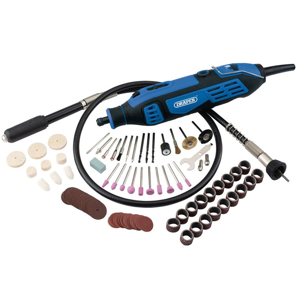 Unleash your inner craftsman with the Draper 180W Rotary Multi-Tool Kit. This versatile tool handles drilling, cutting, grinding, and polishing with effortless precision. Its 180W motor delivers smooth power for any task, while the variable speed and spindle lock provide ultimate control. This comprehensive kit includes 111 accessories, including 23 cut-off wheels, 31 grinding wheels, 18 sanding bands, 9 wool wheels, 8 diamond bits, 5 grinding stones, 4 cutting discs, 3 brushes, 3 multipurpose bits, 3 collets, a diamond ball, sanding drum, flex shaft, and wrench – everything you need for a wide range of projects. Equipped with a 1.8m cable and BS plug for convenient use.