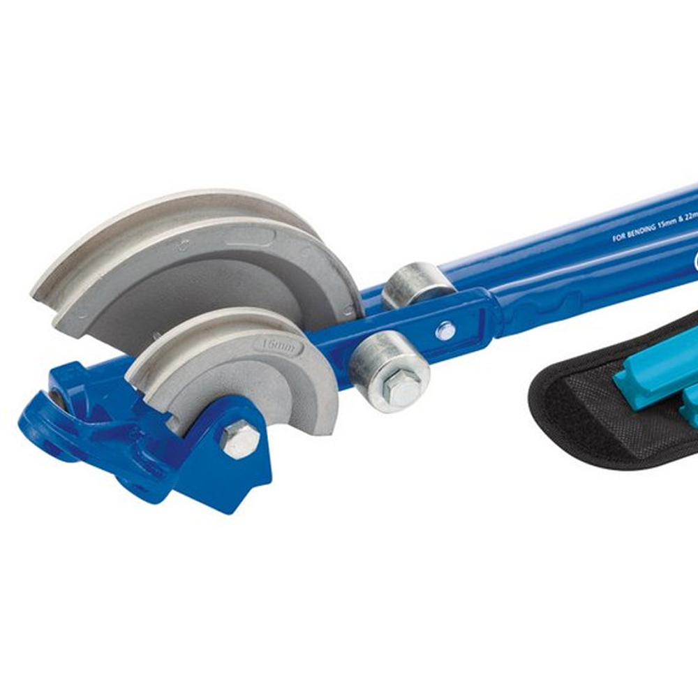 Effortlessly bend copper pipes with the Draper Tube Bender. This robust tool is designed for 15mm and 22mm O/D tubes. Heavy-duty die-cast steel formers and case-hardened carbon steel rollers ensure lasting performance. Ergonomic tubular steel handles with PVC cushioned grips provide superior comfort and control. Anodized aluminium guides offer precise alignment. The tube bender is supplied with a canvas storage bag.