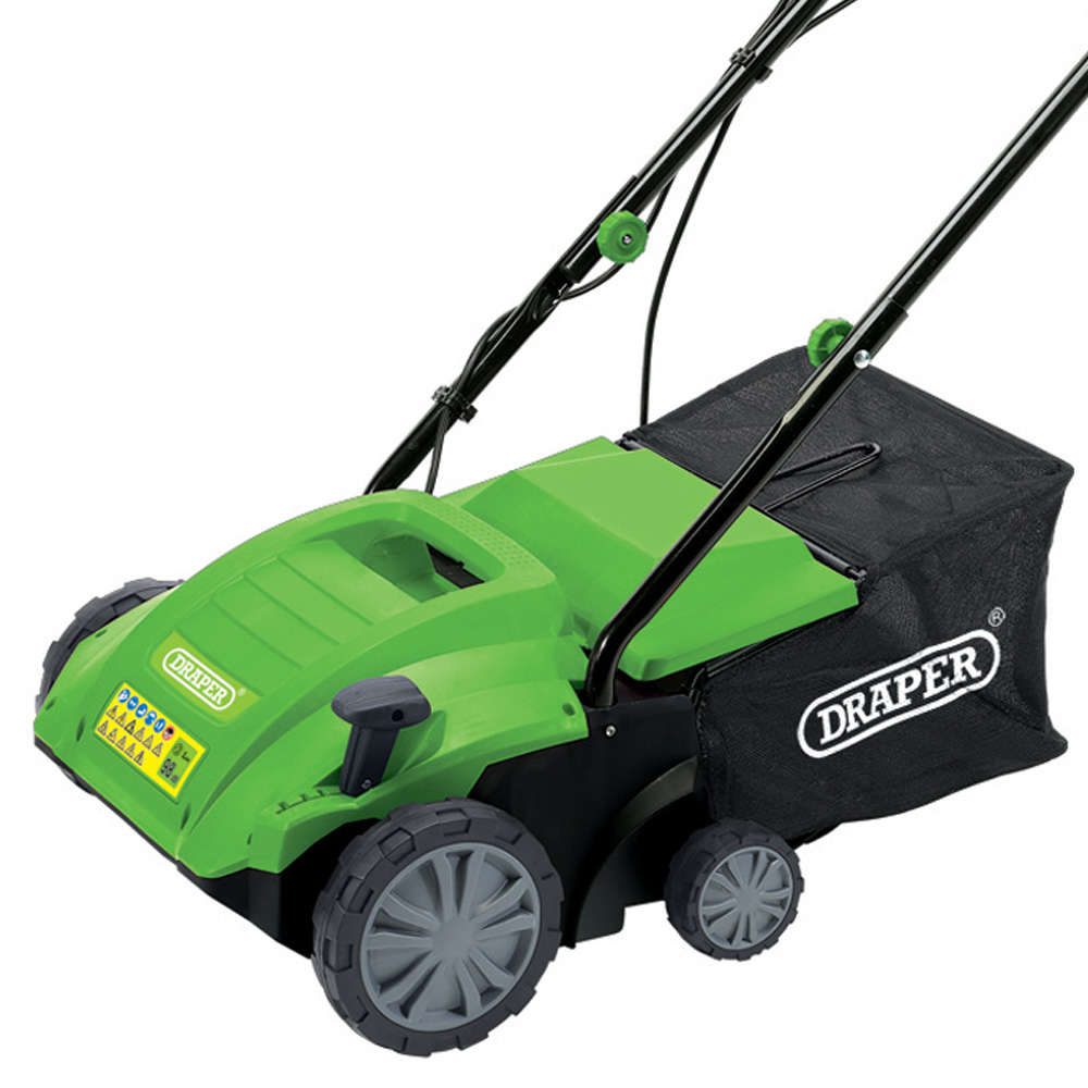 Transform your lawn into a lush paradise with the Draper Tools 230V Lawn Aerator, perfectly designed for small to medium-sized lawns. This versatile machine features a powerful 1500W motor and a generous working width of 320mm, making it an efficient choice for lawn care. Equipped with 20 tines, it effectively aerates the soil, enhancing drainage and promoting healthier grass growth. The aerator excels at revitalizing your lawn by removing moss, thatch, and dead grass, ensuring a thriving green space. With 16 robust steel blades, it penetrates deeper than traditional rakes, efficiently uprooting debris for a cleaner finish. Tailor the depth of operation easily using the conveniently located adjustment lever next to one of the front wheels. Designed for user comfort, this lightweight machine weighs only 9.3kg, making it a breeze to manoeuvre around your garden. It includes a spacious 30L collection bag for easy debris disposal, and the handle conveniently folds for compact storage. Plus, a carry handle on the motor unit adds to its portability, making lawn care a hassle-free experience.