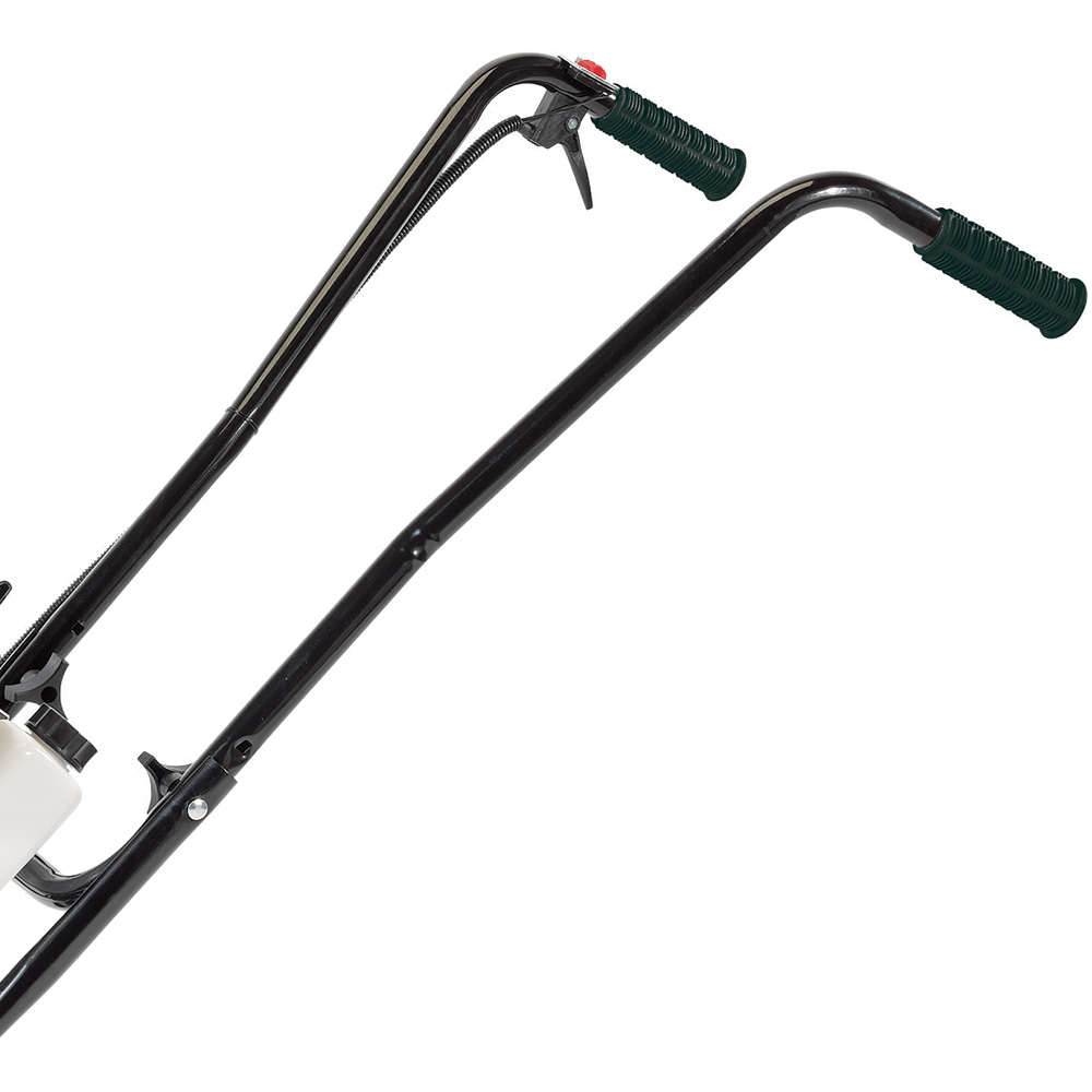 Transform your garden with the Draper 32329 Petrol Tiller and Cultivator. This lightweight rotavator effortlessly prepares soil for planting flowers or vegetables. Its 42.7cc, 2-stroke single-cylinder petrol engine with recoil start delivers reliable power. The 320mm working width, equipped with six effective tines, handles all soil types with ease. Handlebar steering provides excellent control, complemented by an easily accessible throttle for precise tine speed adjustment. Cultivate to a depth of up to 150mm, with adjustable handlebar height for comfortable operation. Convenient transport wheels and folding handlebars ensure easy manoeuvrability and storage. This tiller uses E10 fuel and requires the addition of 2-stroke oil. Fuel tank capacity: 0.9L. Weight: 15.5kg.