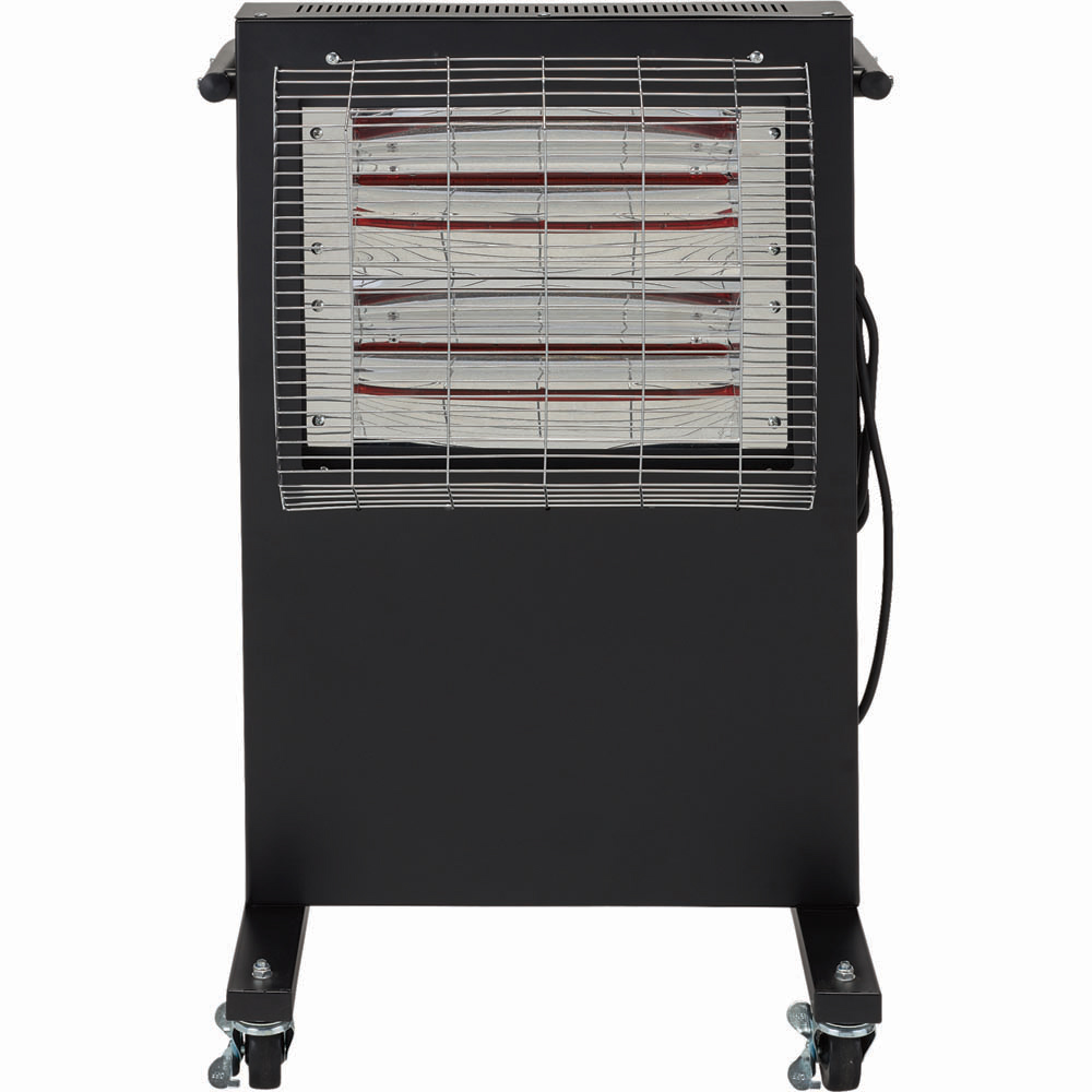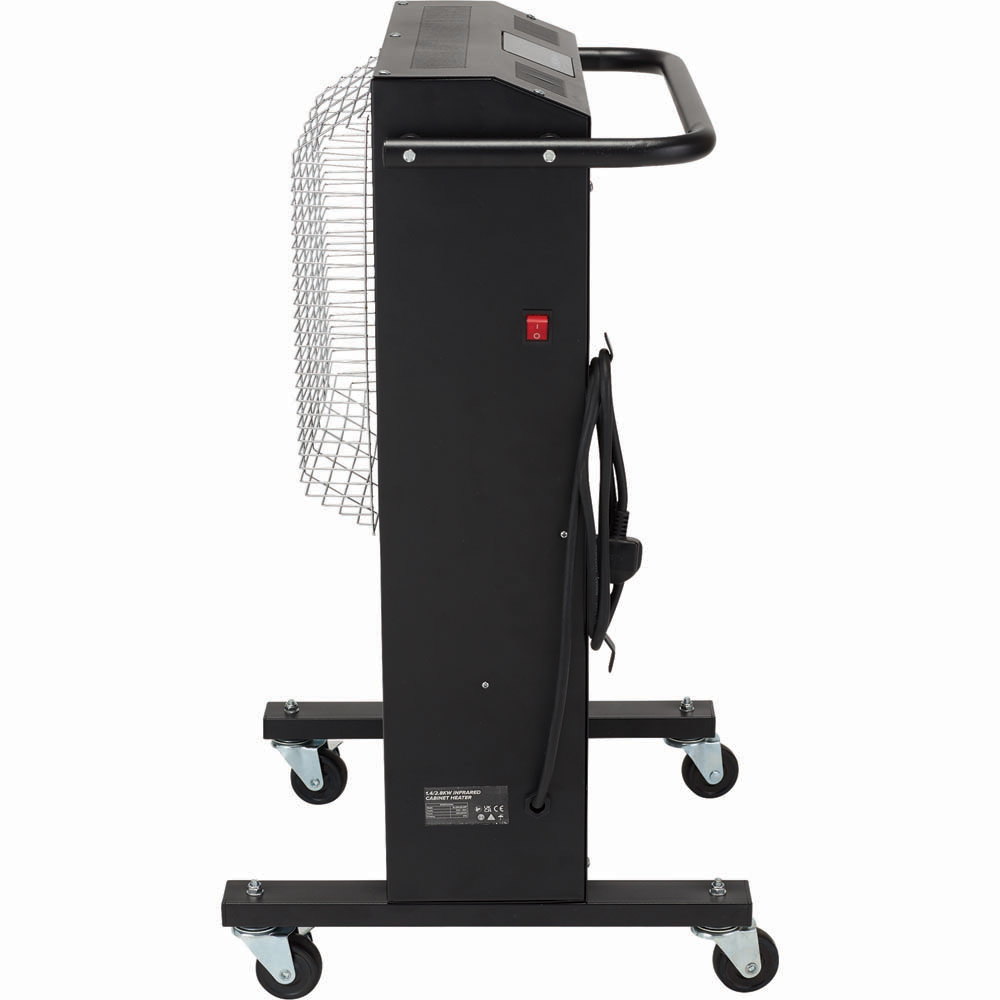 Effortlessly heat large spaces with this powerful infrared cabinet heater. Perfect for warehouses and building sites, its 2.8kW output and 95% efficiency deliver targeted warmth where you need it most—ideal for staff comfort or processes like drying walls, paintwork and plaster. Featuring twin ruby halogen elements with two heat settings (both elements can be activated or just one), it boasts an adjustable thermostat (15-45°C) and automatically switches off once the target temperature is reached when using the second element. Programmable standby mode and a remote control add convenience. A soft-touch electronic control panel with LED display ensures easy operation, complemented by safety features like a tilt cut-out switch and lockable casters (two of four multi-directional). Includes a 2m cable and plug. Heat output: 9553 BTU. Supply: 230V. Powder-coated metal cabinet construction ensures durability.