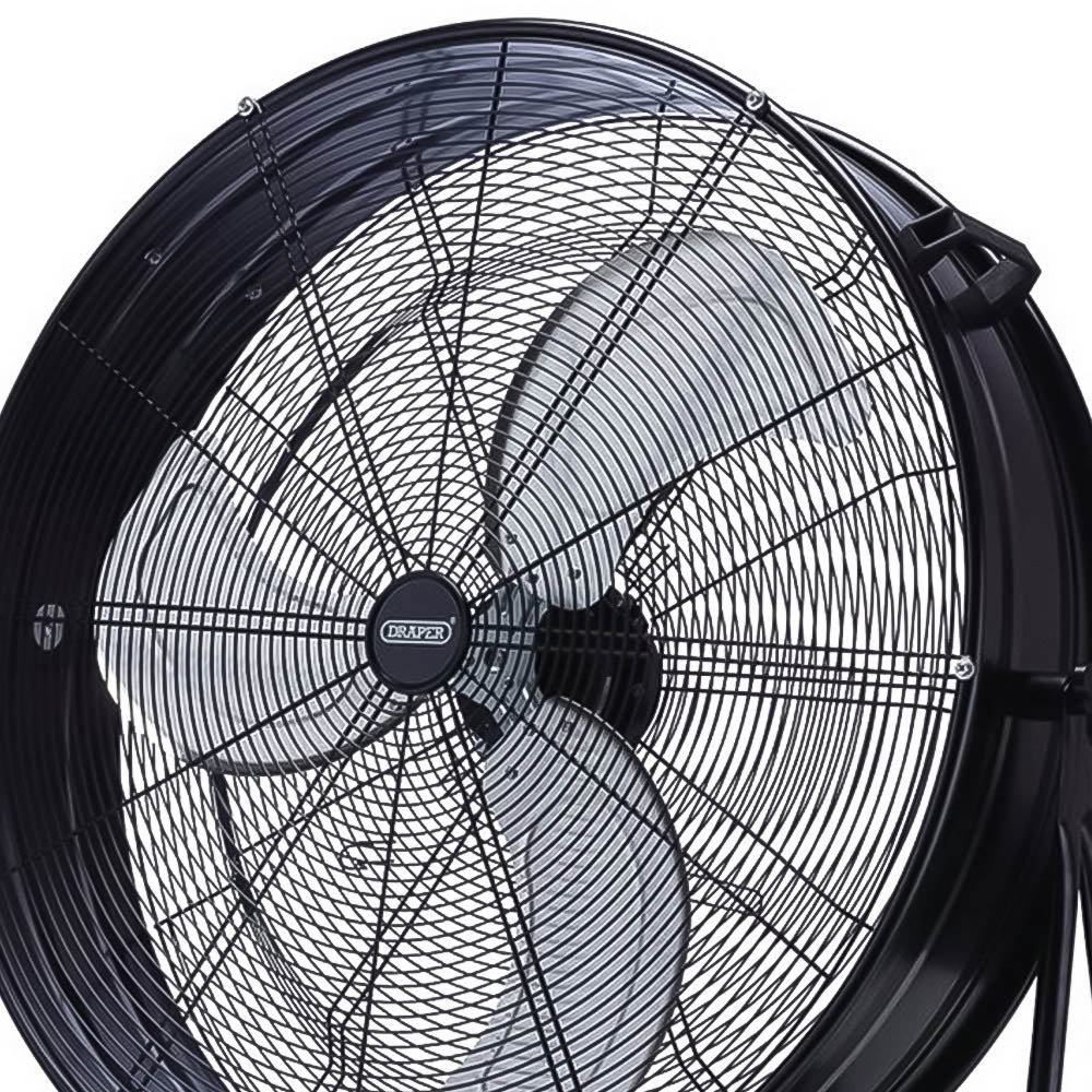 Cool large spaces efficiently with the Draper Black and Silver High Velocity Drum Fan. Its 30-inch diameter and powerful 125W full copper motor deliver high-velocity airflow, ideal for industrial, commercial, or leisure settings. Three speed settings and a tilt function provide precise airflow control. Durable all-metal construction ensures lasting performance. Easy mobility is provided by a built-in handle and large rubber wheels. Operates at 110V/50Hz. CE and UKCA|ERP compliant. Dimensions: H91 x W91 x D32cm.