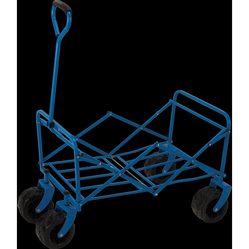 Effortlessly transport heavy loads with the Draper Blue Folding Trolley. Its robust steel frame, reinforced with an internal double liner, ensures exceptional strength and durability, supporting up to 80kg. Large, easy-rolling wheels and a comfortable EVA foam grip handle make manoeuvring a breeze. This convenient trolley folds flat for compact storage and transport, ideal for various uses from gardening and site work to family outings at the beach, festivals, or campsites. Dimensions: 56cm H x 98cm W x 62cm D (Folded: 18cm H x 75cm W x 62cm D.