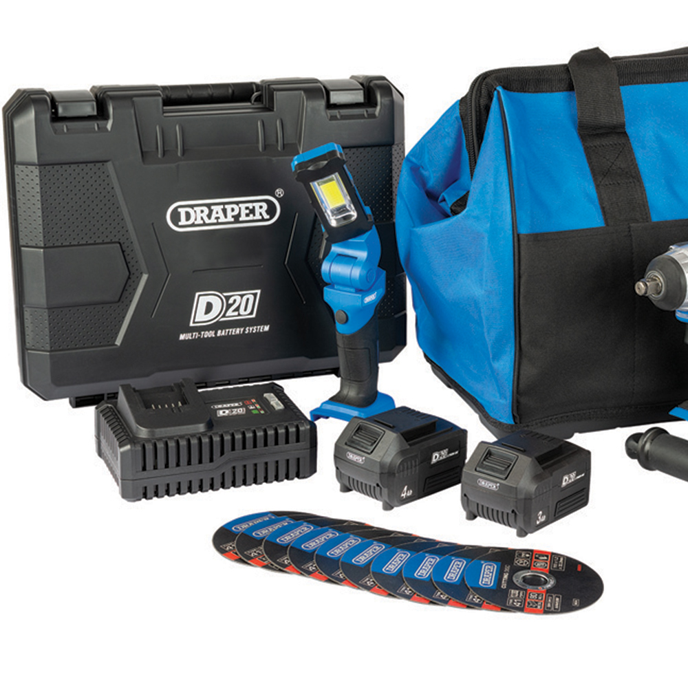Power up your workshop with the Draper D20 20V workshop kit—a comprehensive collection of tools built for everyday tasks. This kit includes a brushless combi drill, brushless impact wrench, and a brushless 115mm grinder, all powered by the convenient D20 interchangeable battery system. Also included is a D20 Flexi inspection lamp, 3.0Ah and 4.0Ah batteries, a charger, a plastic storage case, and a tin of ten metal cutting discs. Everything is neatly organized in a 440mm hard-bottom tool bag for easy transport and storage. Ideal for mechanics, engineers, and various vehicle maintenance applications, this kit offers an affordable solution for your workshop needs.