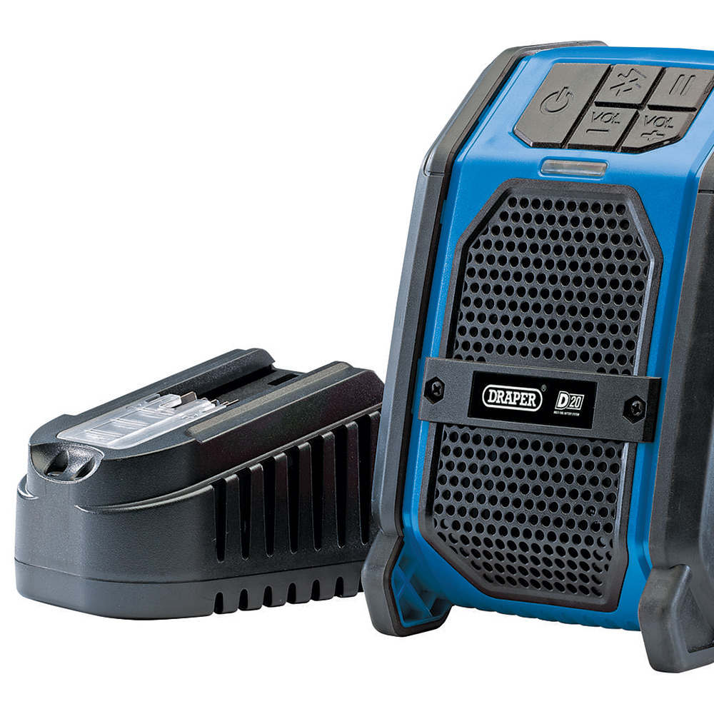 Unleash the power of sound with the Draper D20 20V Wireless Speaker. This versatile and robust speaker delivers exceptional wireless audio streaming via Bluetooth, seamlessly connecting to your mobile devices. Enjoy music playback with effortless convenience. For added flexibility, an auxiliary port ensures MP3 compatibility, and a USB port provides handy mobile device charging. Part of the essential D20 range, this speaker is perfect for both music lovers and professionals. The speaker utilises a powerful 3.0Ah battery (D20 batteries sold separately, along with the charger) and benefits from the interchangeable D20 battery system, allowing use with other D20 series tools. Please note: using the speaker for anything other than its intended purpose constitutes misuse.