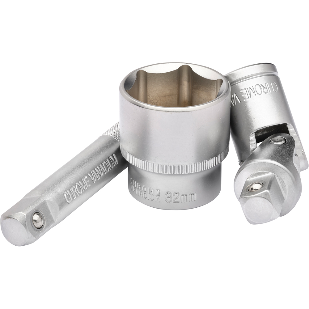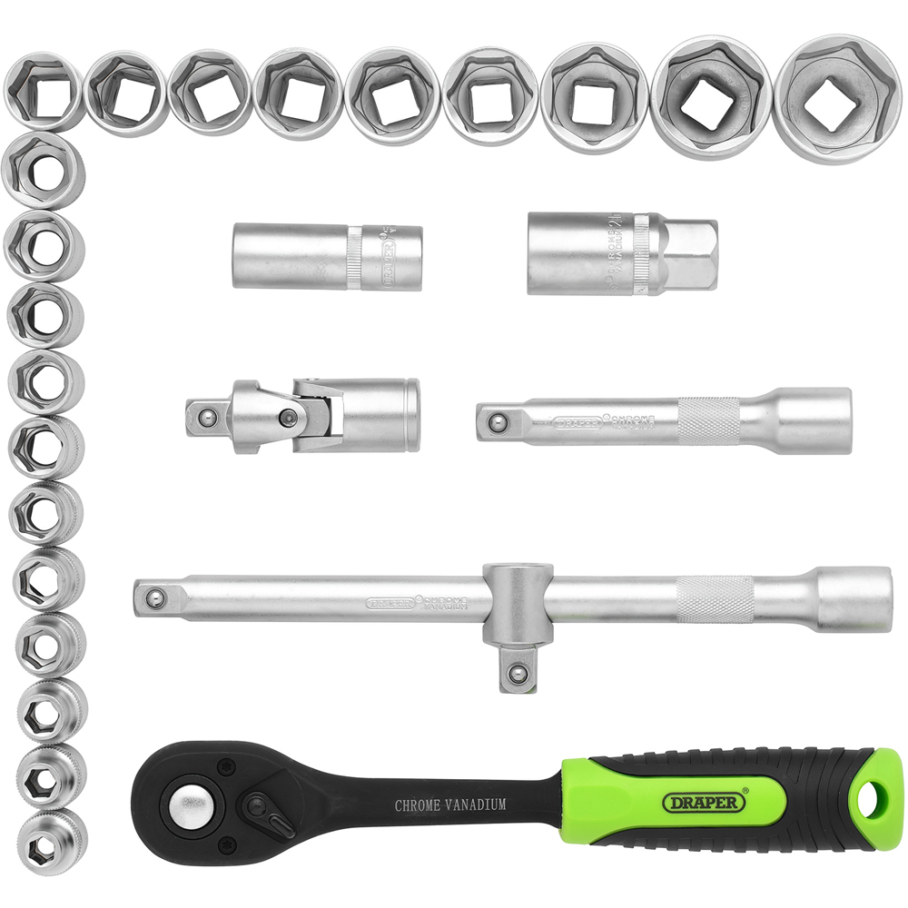 Elevate your mechanic's toolkit with this remarkable Draper HI-TORQ 27 Piece Metric Socket Set made from resilient chrome vanadium steel and finished in sleek satin chrome. Covering an extensive range of sizes from 8-32mm, this 1/2 inch Sq. Dr. 6-point HI-TORQ socket set includes everything you need for efficient repairs and maintenance. The 72-tooth quick-release ratchet, featuring a comfortable soft grip handle, enhances usability. With extension bars, spark plug sockets, a universal joint, and a 3-way adaptor, all neatly stored in a robust plastic case, this set is designed to tackle any job with ease and precision.