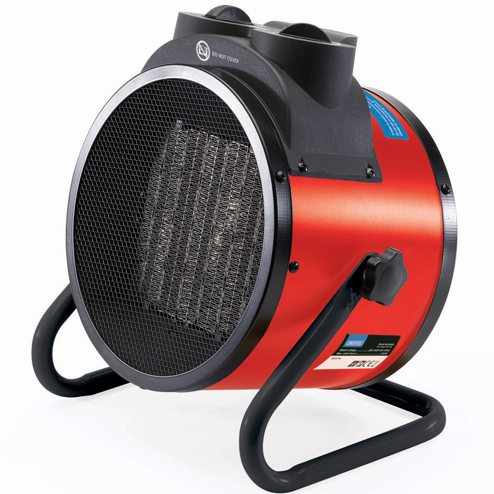 Transform your space into a cosy haven with this Draper PTC Electric Space Heater. This 2.8kW energy-efficient electric heater uses Positive Temperature Coefficient (PTC) technology, enabling fast, high-volume heat output from switch-on. Designed for use in enclosed spaces up to 35 square metres in size. This high-output heater has a built-in thermostat that can maintain a constant room temperature. There is a fan and two heat settings, and the stainless-steel heater element is fitted with dual overheat safety protection. It has a compact design with a tough steel shell fixed to a steel tubular frame with adjustable tilt to direct airflow. Heat output: 9550 BTU. Supply: 230V.