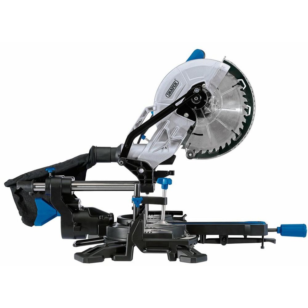 Unlock unparalleled precision with the Draper Sliding Compound Mitre Saw, designed for those who demand quality and accuracy in their projects. Featuring a D-shaped handle, this pull saw includes a pull facility and depth stop, perfect for executing precise trenching tasks with ease. The integral dust extraction outlet and bag, along with extension wings, a stop bar, and a laser beam cutting guide, ensure a tidy workspace while enhancing your cutting accuracy. The laser beam allows you to visualize the saw blade path prior to cutting, elevating your precision. Its lightweight aluminium base facilitates effortless movement around your workshop or job site. Supplied with a fitted cable and approved plug, this saw also comes with a hex key, collection bag, and a 40T TCT saw blade for immediate readiness. Key specifications include an 1800W power output, a blade diameter of 255mm (10"), and a cutting speed of 5000r/min. It accommodates cross cuts of 75 x 305mm and mitre cuts of 75 x 210mm, making it an essential tool for any serious DIY enthusiast. Weighing only 14kg, it combines portability with robust performance.