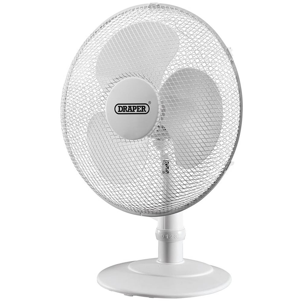Enjoy cool comfort with the Draper 16-inch White Desk Fan. Its three-speed operation and 90-degree oscillating, tilting head deliver efficient air circulation for effective cooling. Safety features include front and rear finger guards and an extra-wide base for stability. Designed for reliable performance at 230V/50Hz, this fan boasts a 45W rated input, making it an energy-conscious choice. Dimensions: 59H x 44W x 30D cm.