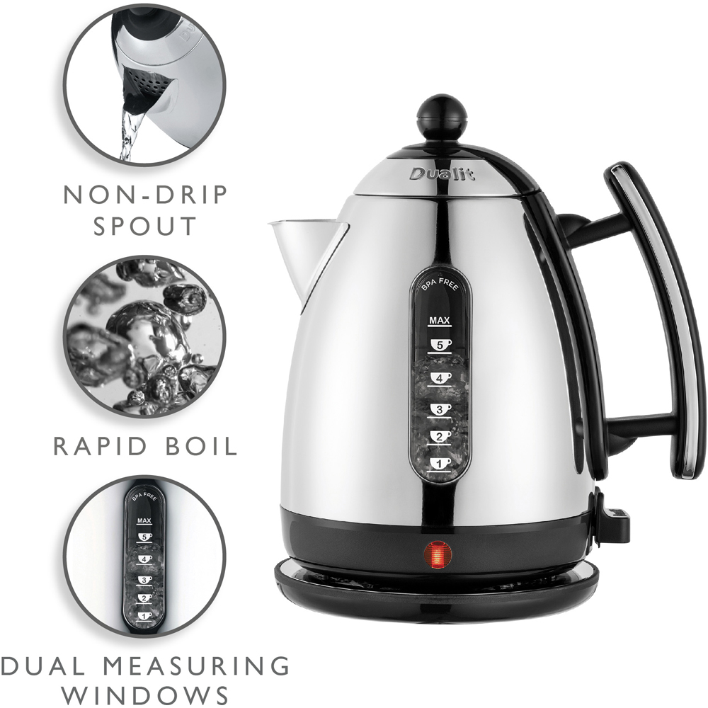 With its sleek black finish, the Dualit Lite Kettle offers a blend of elegance and everyday functionality. Designed with convenience in mind, the easy-pour spout and robust, heat-resistant handle ensure safe and effortless operation. Dual water windows display measurements in litres on one side and cup quantities on the other, allowing for accurate filling. Boasting a rapid 3000W concealed element, this kettle provides quick boiling and easy descaling. Its cordless design, complete with a 360° base and integrated cord storage, helps maintain a clutter-free kitchen. Featuring a 1.5L capacity, boil-dry protection and rapid boil functionality, the Dualit Lite Kettle combines reliable performance with contemporary style.