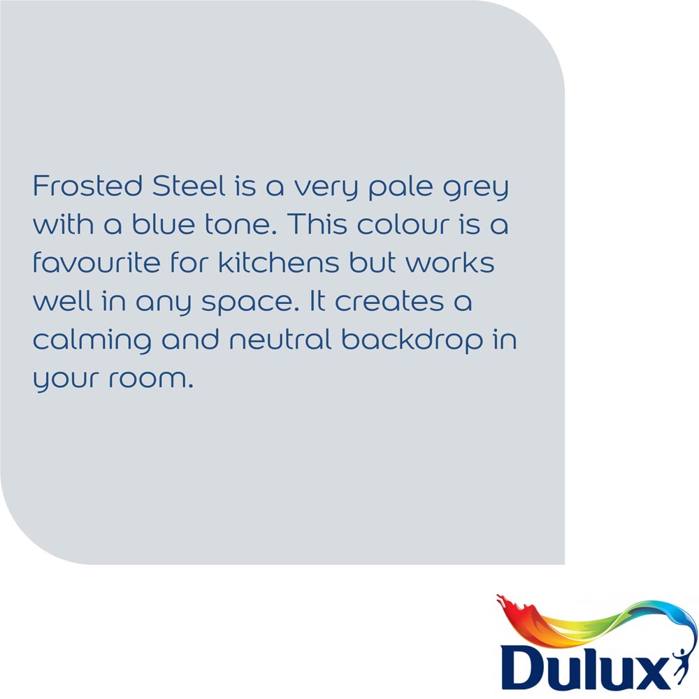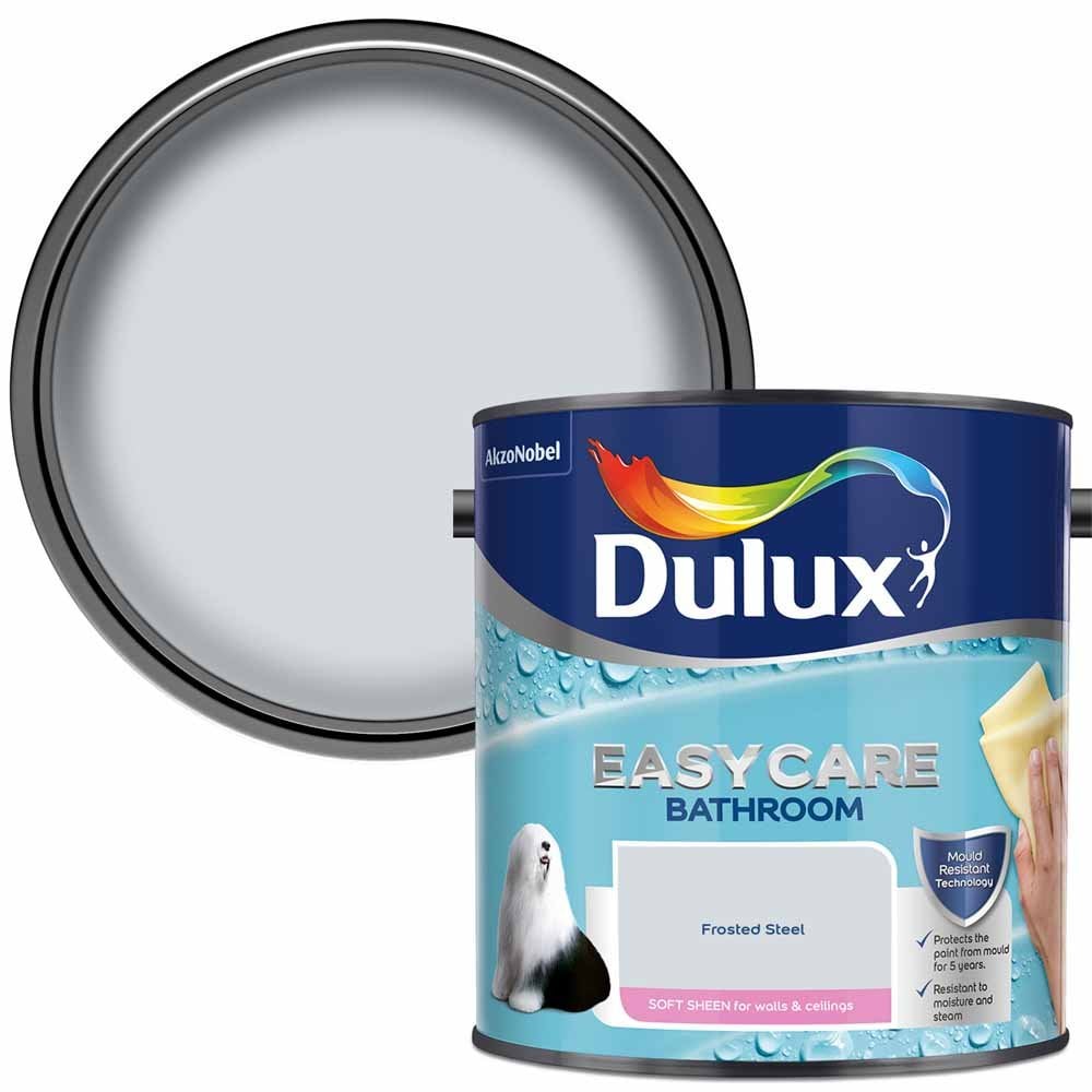 Dulux Bathroom+ Soft Sheen: a remarkably durable paint, resistant to moisture and steam. MouldTec technology safeguards against mould growth for five years, maintaining your bathroom',s fresh look. Each litre covers 13 square metres. Allow six hours drying time between coats, and a full 24 hours before exposing the painted surface to condensation. Chromalock, our exclusive colour protection technology, creates an invisible shield against daily wear and tear, preserving vibrant colour for years to come.