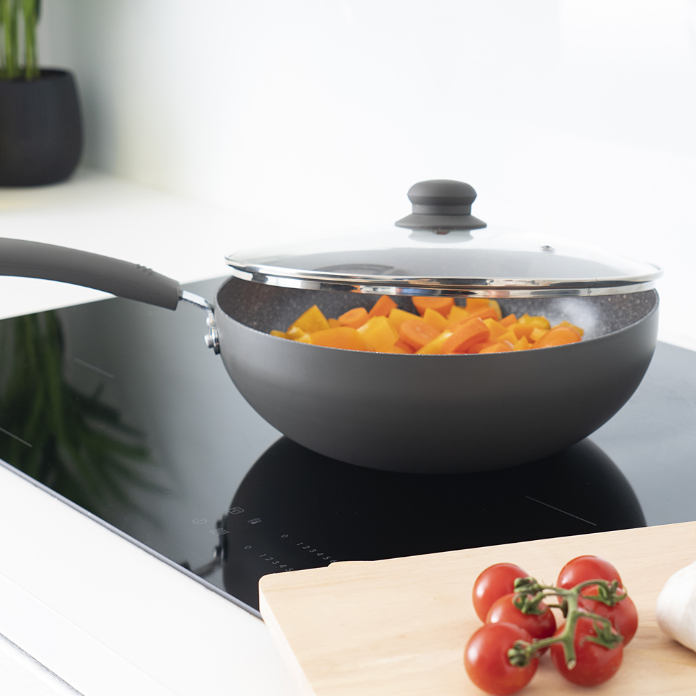 Elevate your cooking experience with the Durastone 28cm Non-Stick Aluminium Wok with Lid. Crafted from heavy-duty grey aluminium, this wok boasts a hard-wearing non-stick ceramic stone interior, enabling you to prepare delicious meals with little or no fat, oil, or butter for a healthier lifestyle. Ideal for stir-fries, curries, and chillies, this wok is designed with a toughened glass lid featuring a steam vent for convenient cooking. The soft-touch grey handle ensures a secure grip, and it is suitable for all hob types, including induction. Unleash your culinary creativity with this versatile essential.