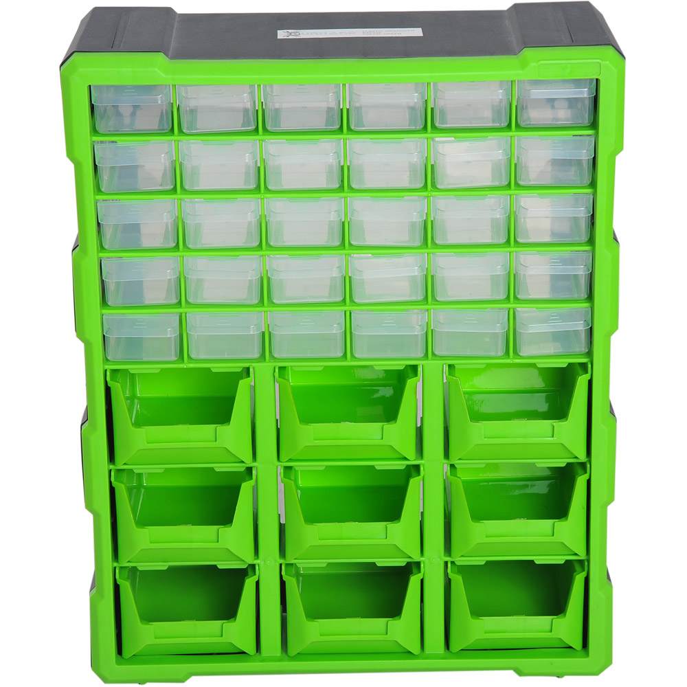 The Durhand Green 39-Drawer Storage Cabinet keeps your tools and small accessories neatly organised. Perfect for garages, repair shops, sheds, or workshops, its transparent drawers let you quickly locate items. Made of durable polypropylene, each drawer includes a built-in stop to prevent accidental spills.