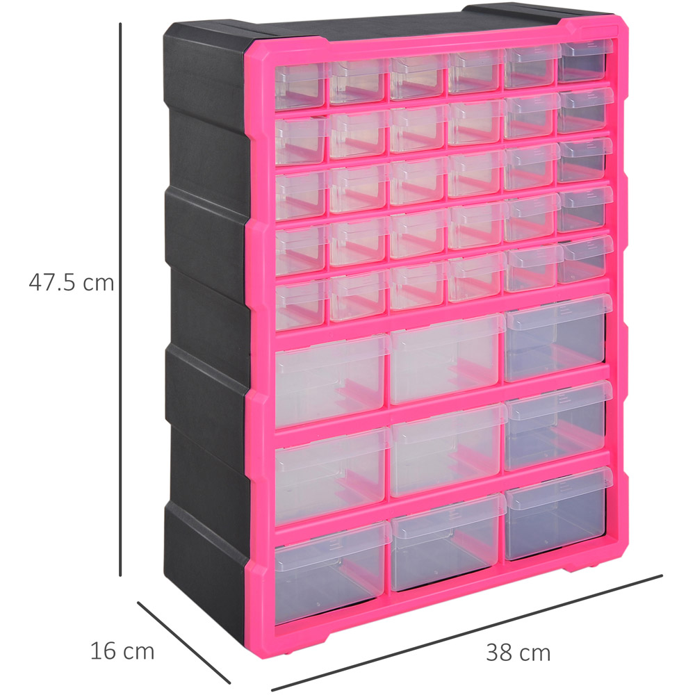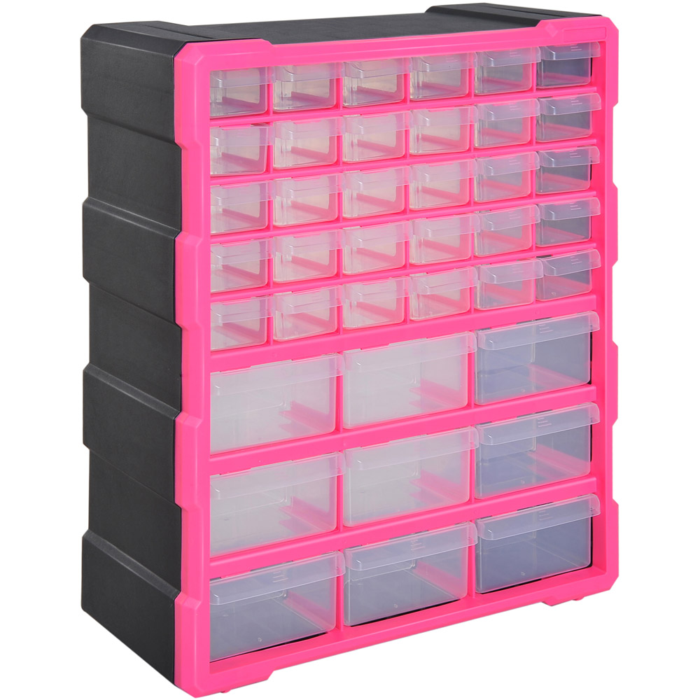 The Durhand Pink 39-Drawer Storage Cabinet: the ultimate tool organizer. Perfect for garages, repair shops, sheds, or workshops, this cabinet keeps small parts and accessories neatly organized. Its transparent drawers allow for quick identification of contents, saving you valuable time. Made from durable polypropylene, each drawer features a built-in stop to prevent items from falling out.