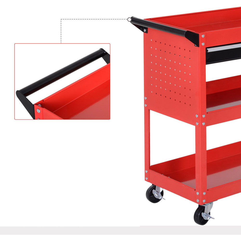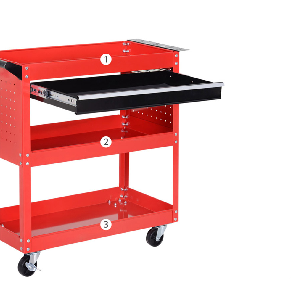 This red 3-tier tool trolley from Durhand is the perfect solution for keeping your DIY tools organised. Three spacious trays and a handy sliding drawer provide ample storage for all your essentials and small accessories. Move it around your garage or workshop with ease thanks to its four wheels – two universal and two directional. A practical storage solution for any space.