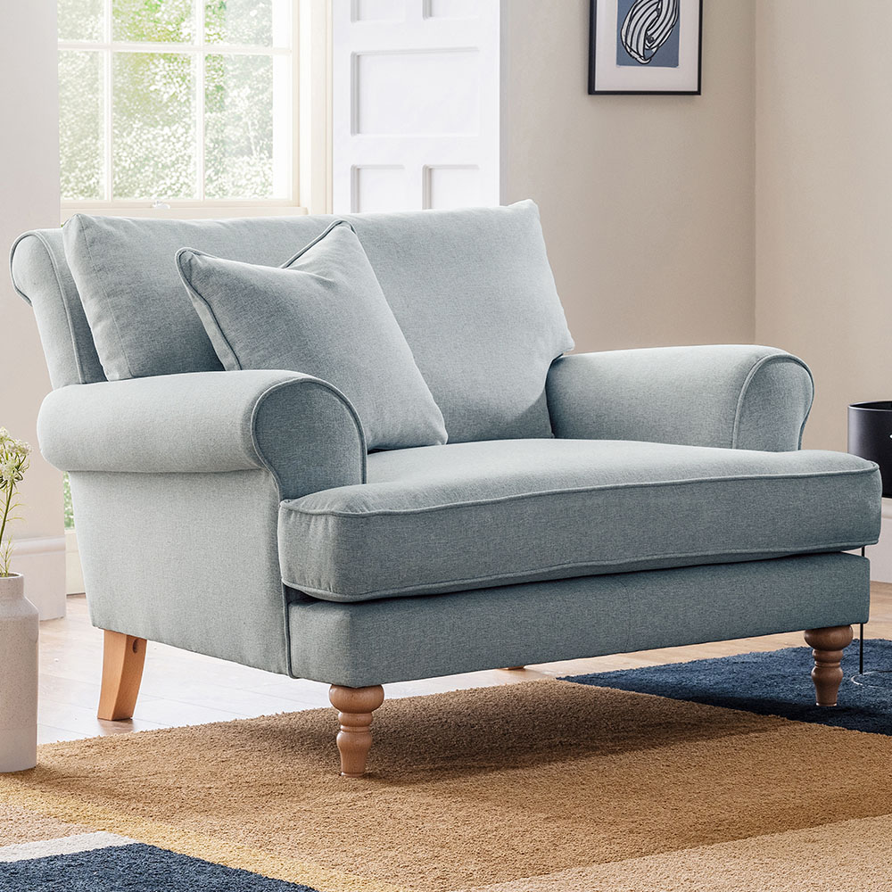 A modern twist on a beloved design, the Eastwood Faro Ashen Snuggle Chair exudes both classic charm and contemporary style. Its deep scroll back and elegantly tapered arms provide a touch of traditional elegance, while the turned wooden legs add a modern flourish. Upholstered in a stylish slub weave fabric, this chair makes a striking focal point in any room. Sink into the deeper, low-slung seat, designed for ultimate relaxation, and enjoy the added comfort of coordinating scatter cushions.