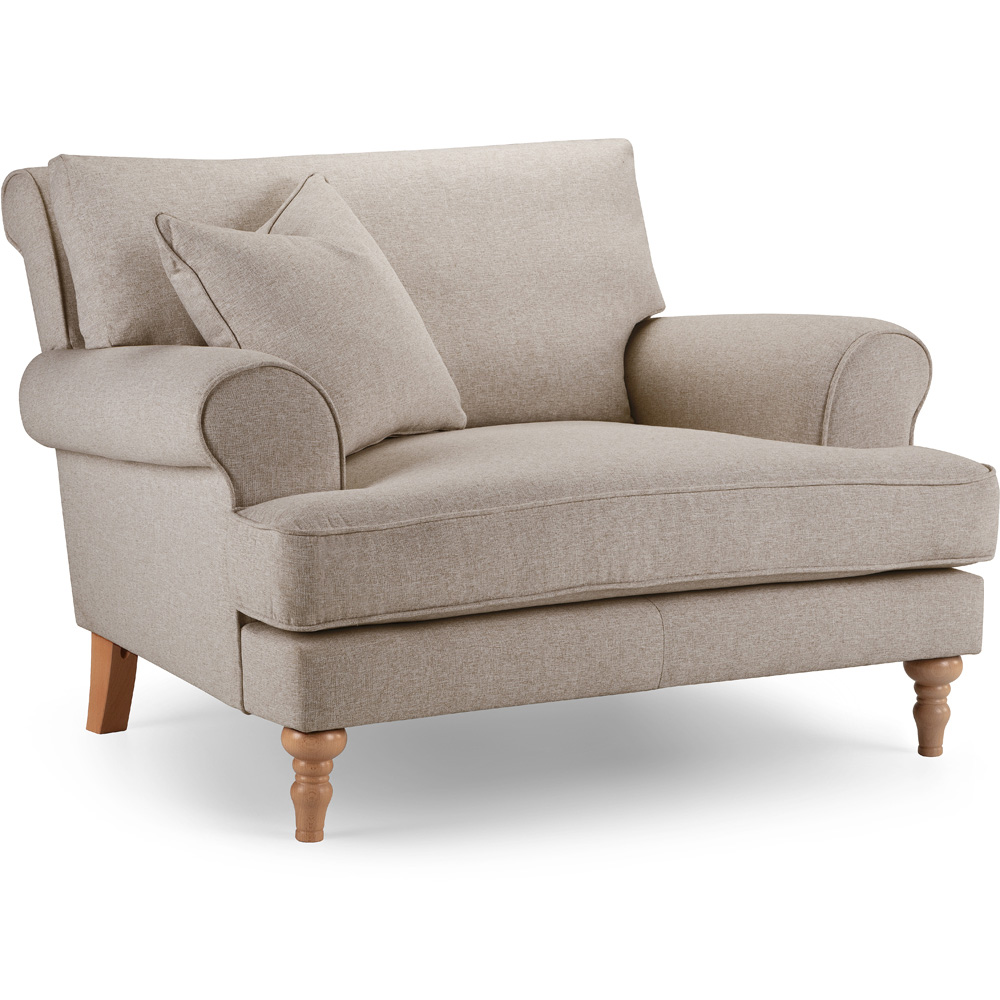 Sink into the inviting embrace of the Eastwood Faro Snuggle Chair in beige. This contemporary take on a timeless classic design showcases a deep scroll back, complemented by elegantly tapered arms and traditional turned wooden legs. Upholstered in a stylish slub weave fabric, this chair makes a stunning statement in any living space. Designed with relaxation in mind, its deeper, low-slung seat is perfect for lounging, and it comes complete with coordinating scatter cushions for added comfort and style.