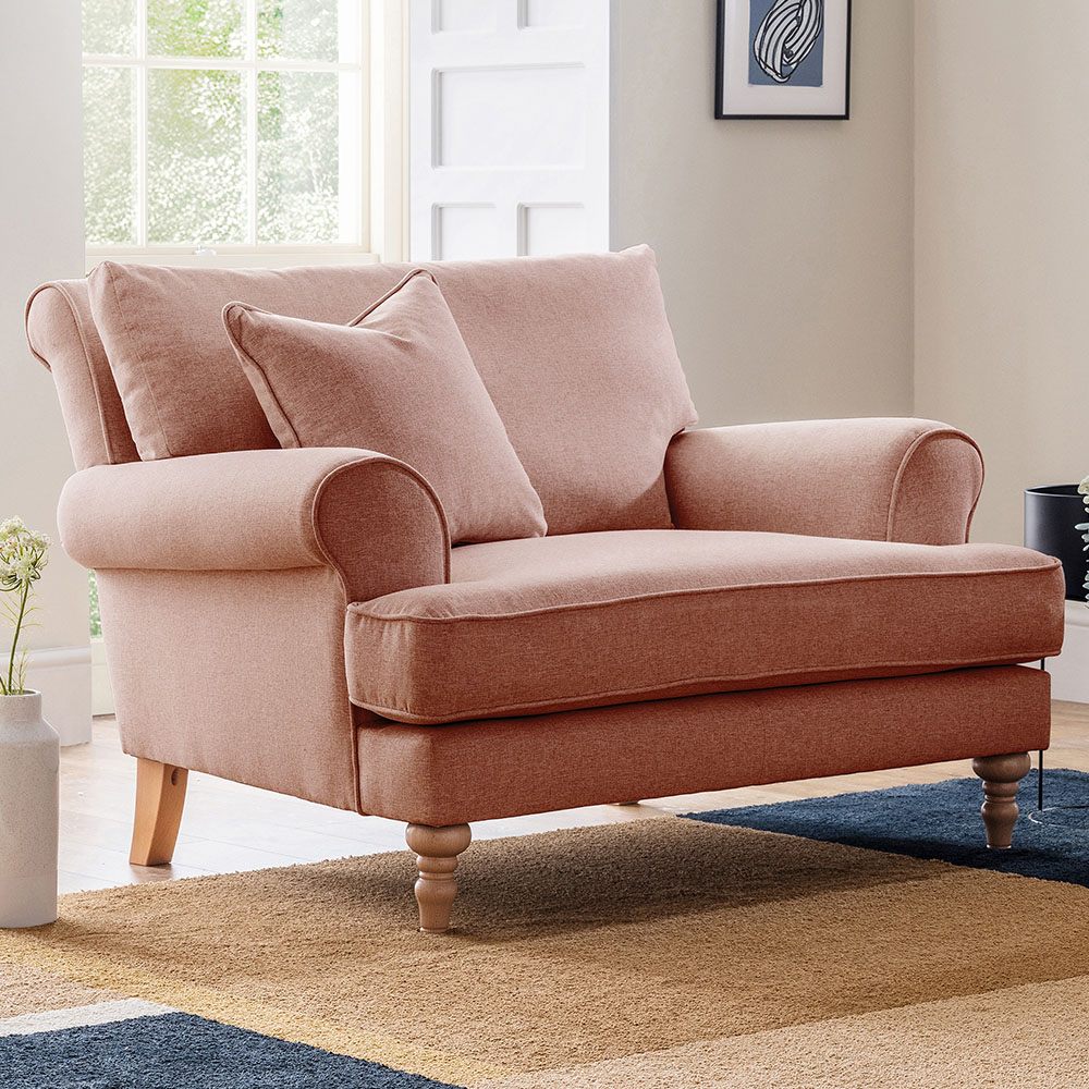 The Eastwood Faro Coral Snuggle Chair offers a modern twist on a much-loved classic. With its deep scroll back, elegantly tapered arms and turned wooden legs, it's a beautiful balance of traditional charm and modern style. Upholstered in a stylish slub weave fabric, this chair makes a stunning statement. Designed for ultimate comfort, it boasts a deeper, low-slung seat that's perfect for lounging and comes complete with coordinating scatter cushions.