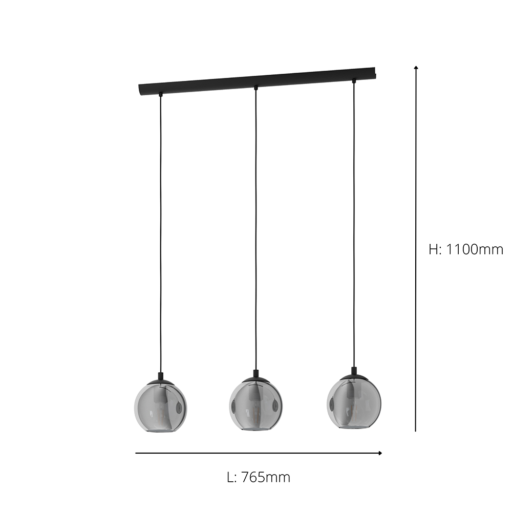 The Ariscani 3 Light Pendant offers distinctive lighting for your living room or dining table. Three round smoked glass shades, each with a transparent black finish, hang elegantly from a long black metal canopy. This modern and minimalist design requires three E27 lightbulbs (not included). With an IP20 rating, this pendant light adds a stylish touch to any contemporary interior.