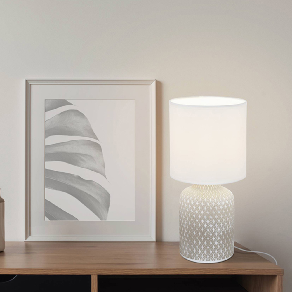 Illuminate your space with the EGLO Bellariva Cream and White Table Lamp. Its elegant design features a curved ceramic base in grey with an intricate pattern, topped with a classic white fabric shade. This versatile lamp effortlessly blends contemporary and traditional styles, making it a perfect addition to any room. Conveniently controlled by an in-line switch, it casts a warm, inviting glow in bedrooms, living rooms, dining areas, or hallways. The lamp uses an E14 lamp holder and requires a single E14 lightbulb (not included).