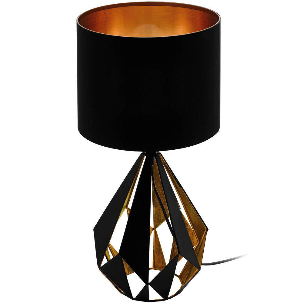 Illuminate your space with the EGLO Carlton 5 table lamp. Its eye-catching geometric design boasts a diamond-shaped black metal base and a round black fabric shade, accented by a warm copper inner lining. This stylish lamp offers effortless operation via its convenient in-line switch and is ideal for bedrooms, living rooms, dining rooms, or hallways. Complementing diverse interior styles, it creates a cosy ambiance. Requires one E27 lightbulb (not included).