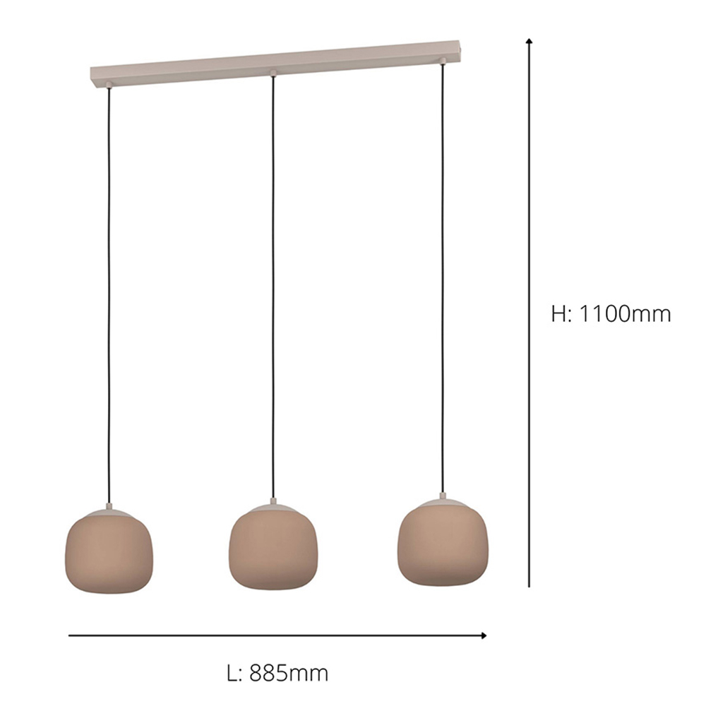 Elevate your space with the Cominio pendant light. Three organically shaped satin glass shades in a sand-coloured finish hang elegantly from a taupe metal canopy. A captivating detail: the shades subtly shift from taupe to a sandy hue when illuminated, adding depth and warmth. This versatile design complements various interiors, ideal for living rooms or dining areas. Requires three E27 lightbulbs (not included). Size: H1100 x D885mm.