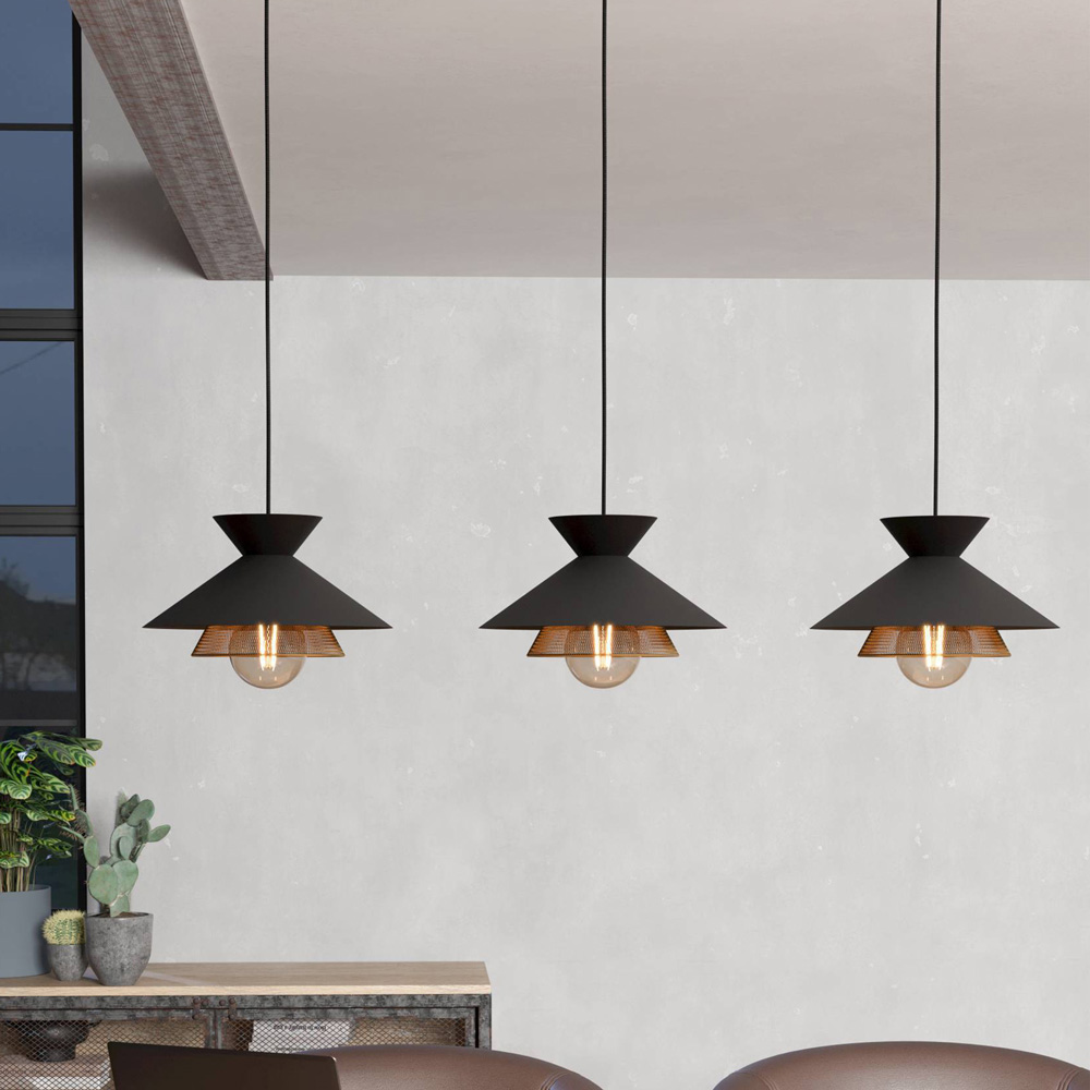 The EGLO Grizedale pendant light features a sleek, modern design with a steel structure and three black conical lampshades, each accented with a brass-coloured inner shade. This striking combination of brass and black creates a visually impactful light fixture inspired by Japanese design trends, perfect for Japandi or industrial-style interiors. Ideal for illuminating living rooms or dining areas, this pendant light provides stunning ambient lighting. It uses three E27 fittings and requires three E27 lightbulbs (not included). The light has an IP20 rating.
